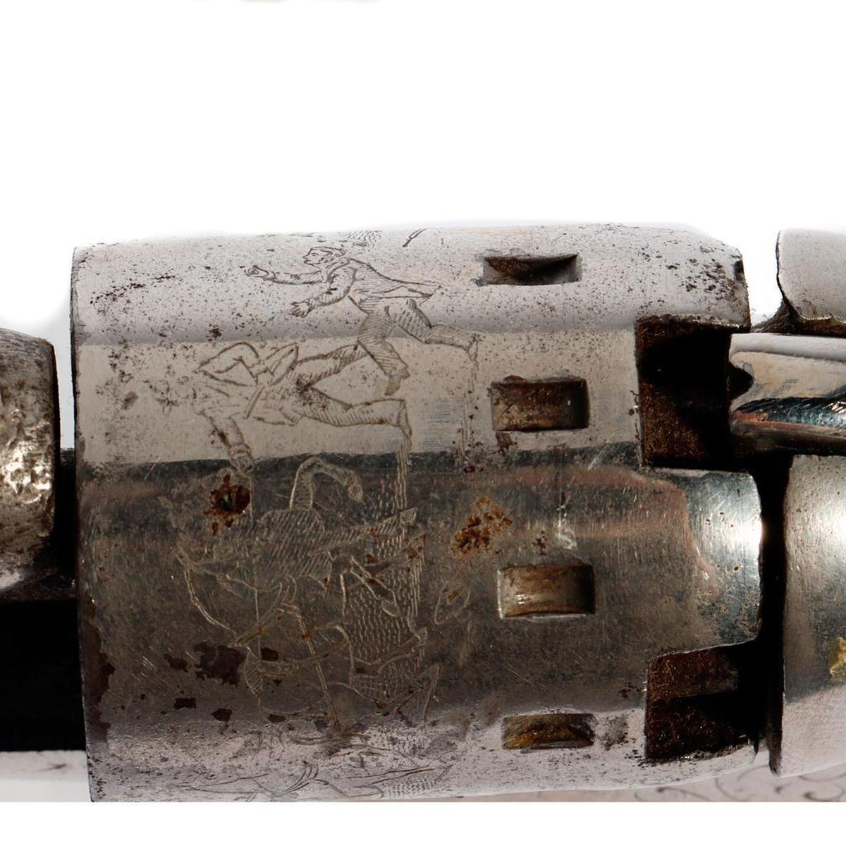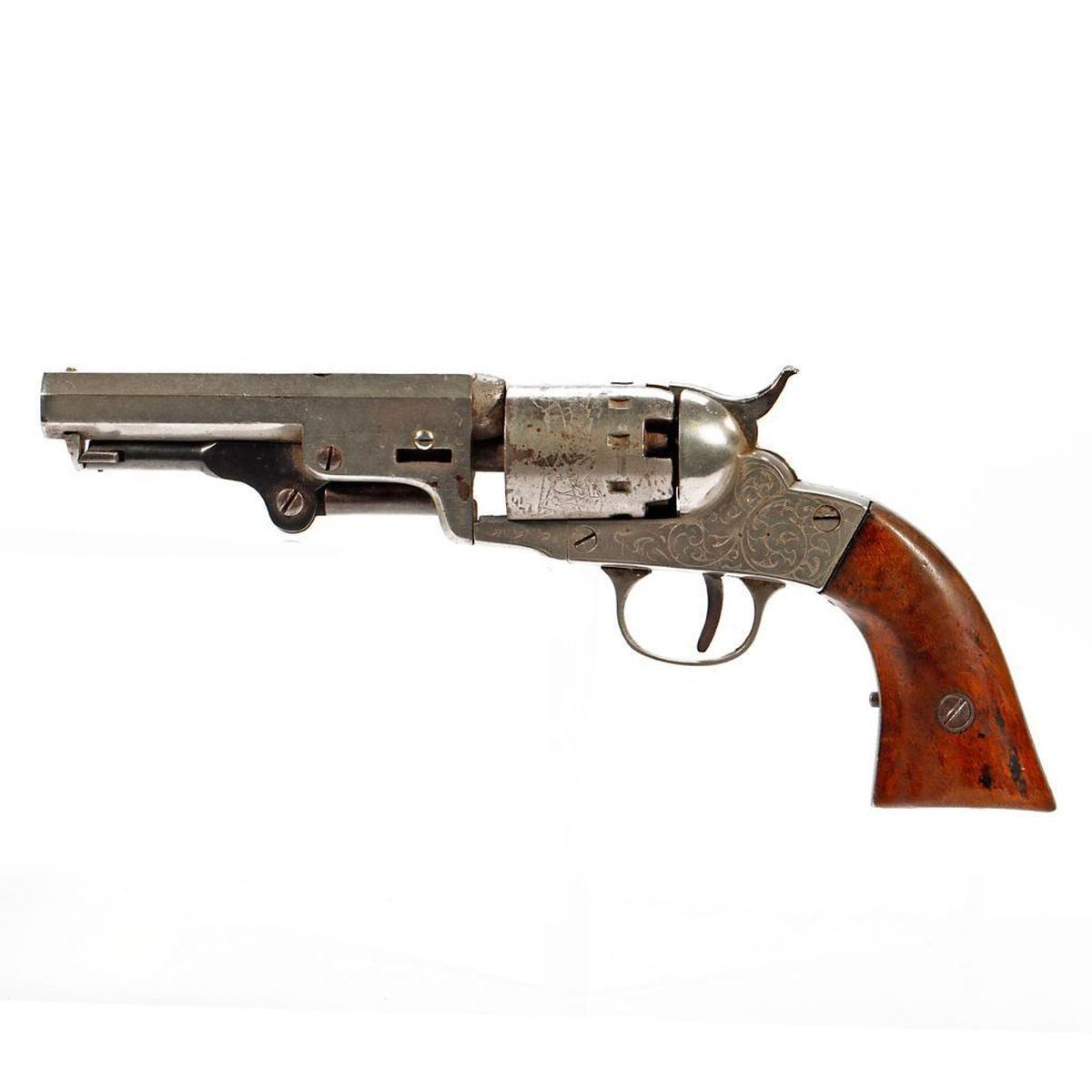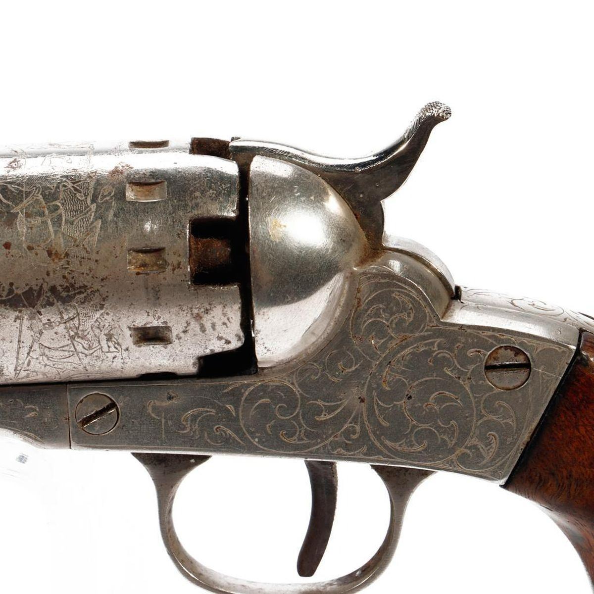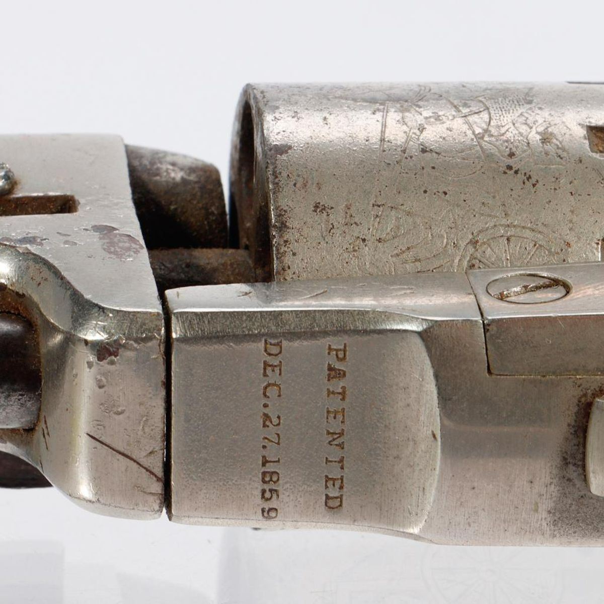 London Pistol Company Revolver. Engraved and stamped "LONDON PISTOL COMPANY, PATENTED DEC.27.1859".4in barrel. Cylinder roll engraved with stage coach hold up scene. Serial number is not visible. Condition Report: All lots are sold as is and where is. Turner Auctions + Appraisals, LLC provides condition reports upon request to aid in your bidding decision. No statement regarding age, condition, kind, value, or quality of a lot, whether made orally at the auction or at any other time, or in writing in this catalog or elsewhere, shall be construed to be an express or implied warranty, representation, or assumption of liability. All sales are final, Turner Auctions + Appraisals, LLC does not give refunds based on condition. Turner Auctions + Appraisals, LLC does not perform any shipping or packing services. We do have a list of suggested shippers who gladly provide quotes prior to your bidding. Please visit our webpage for a list of recommended shippers.