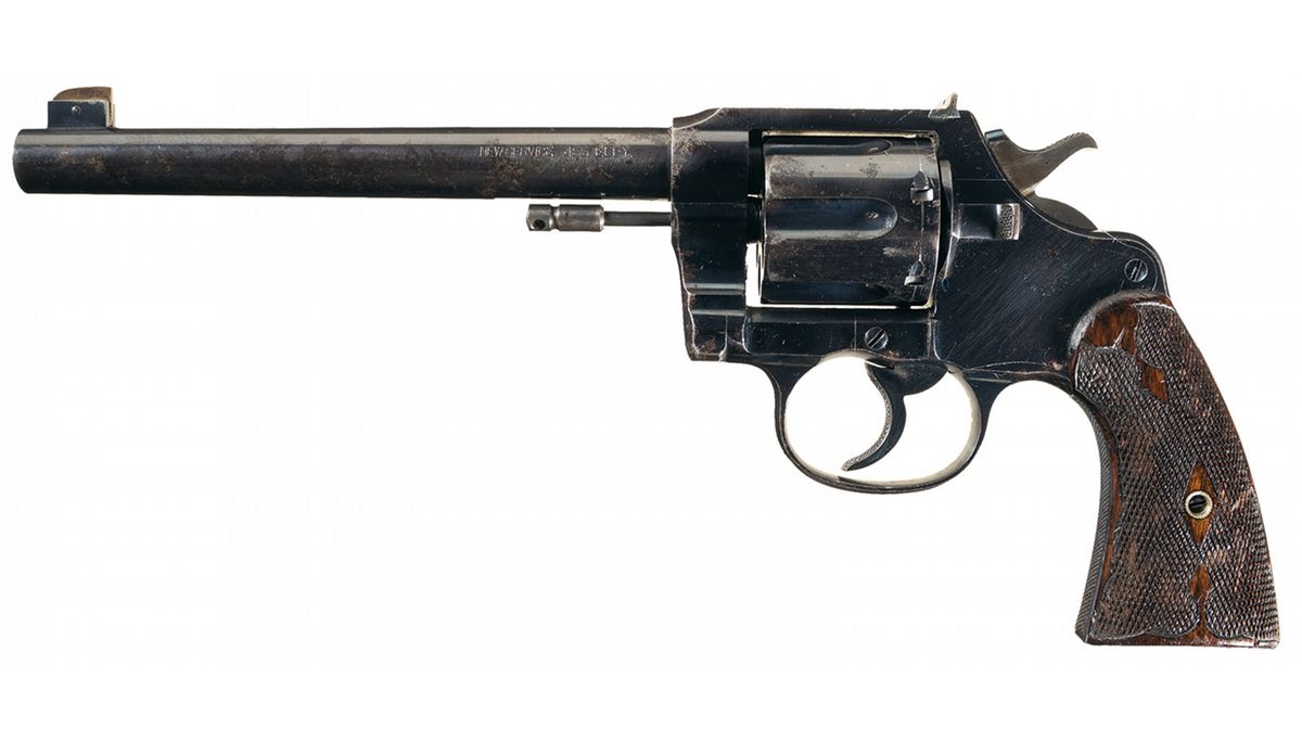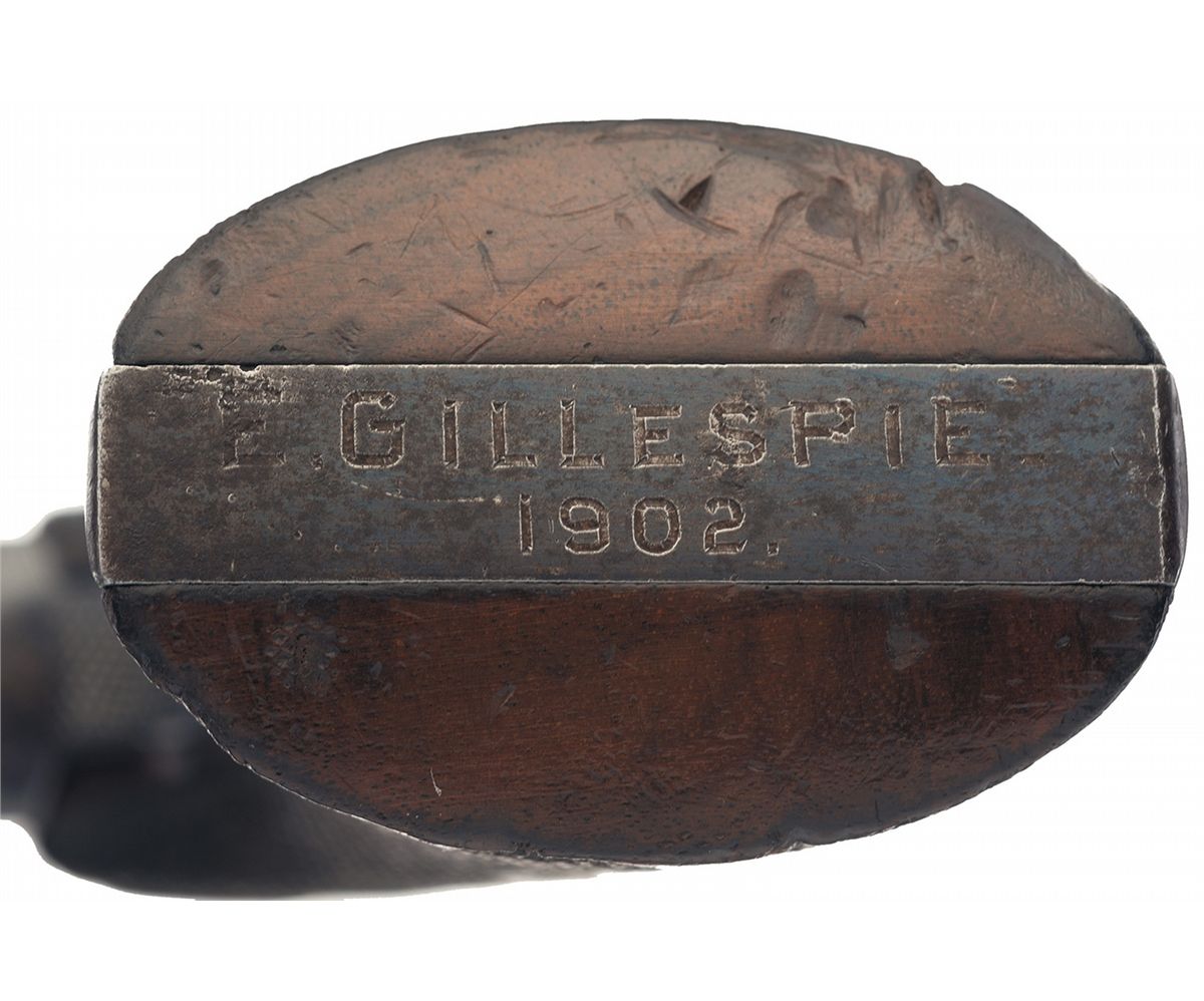 Manufactured in 1902. Brass blade front sight and windage-adjustable notch rear sights, with the two-line address and patent dates on top of the barrel and "NEW SERVICE 455 ELEY" along the left. The London Proof House "crown/V" and "crown/GP" stamps are present on the underside of the barrel and in alternating cylinder flutes, with "&" stamped on the inside of the frame, and the Rampant Colt surrounded by "COLT'S/NEW SERVICE" on the left side. The hammer, trigger and grip straps are all checkered, with a pair of checkered walnut grips. The butt of the pistol is engraved "E. GILLESPIE/1902"; no information on Gillespie was provided with this lot.