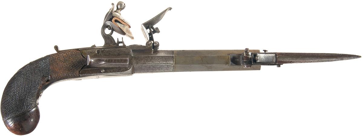 Produced without sights, with "SMITH LONDON" marked on top of the barrel and two "crown/ crossed scepter" proofs on the underside of the chamber. Center mounted hammer, with sliding safety, floral and scroll engraving on the sides, a belt hook on the left and a folding trigger. Mounted to the left side of the muzzle is a 2 5/8" triangular spike bayonet with single fullers and spring loaded latch, with the retainer mounted on the frame. Bag shaped checkered walnut grips, with a silver inscription panel on the rear.