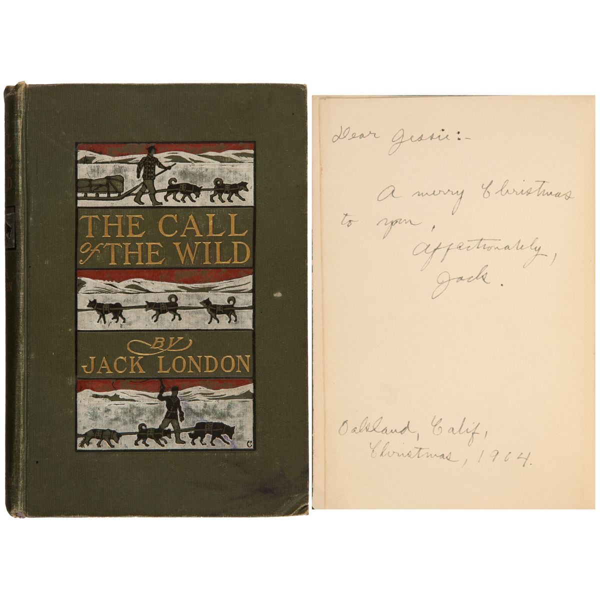 Later edition of Jack London's ''The Call of the Wild,'' signed and inscribed by the author on verso of front free endpaper. Inscription reads: ''Dear Jessie: A Merry Christmas to you, Affectionately, Jack. / Oakland, Calif, Christmas, 1904''. Macmillan Company: New York: 1904. Illustrated by Philip R. Goodwin and Charles Livingston Bull, with eleven full-page color plates, seven in blue functioning as chapter dividers, and numerous textual illustrations. In original publisher's olive green boards. A bright copy in very good condition.