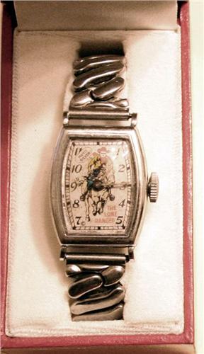 Lone Ranger Character wrist watch with expandable metal band. Face of watch shows The Lone Ranger astride Silver in full gallop. Top left in speech bubble are the words “Hi-Yo Silver”. In bottom right corner in red are the words “The Lone Ranger.” There is some discoloration on face. On back of case is the word Stainless. New box.