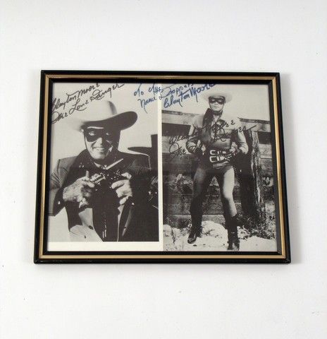Johnny Depp's unusual homage last year brought back great memories and enormous renewed interest in the true and original American hero "The Lone Ranger", Clayton Moore. There really was no other! This is a rare twin Clayton Moore autographed photos, framed. Anything Clayton Moore only goes up in value as the years go by. Hi-Ho. (Approx. 8" x 10").