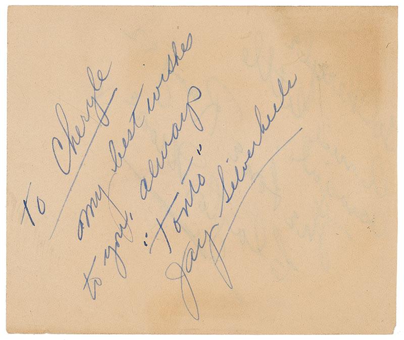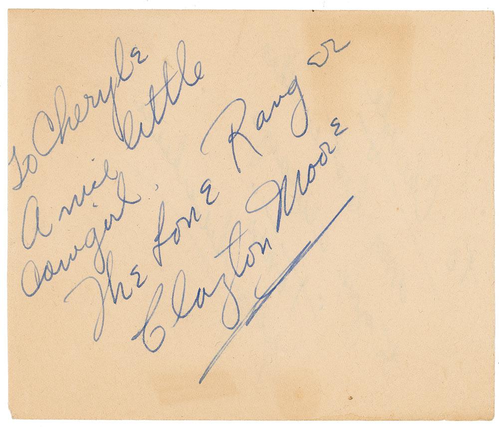 Vintage fountain pen signature and inscription “To Cheryle, My best wishes to you always, ‘Tonto’ Jay Silverheels” and “To Cheryle, A nice little cowgirl. The Lone Ranger, Clayton Moore” on opposite sides of an off-white 5 x 4.25 album page. In fine condition, with scattered creases and areas of moderate toning. Pre-certified PSA/DNA and RRAuction COA.