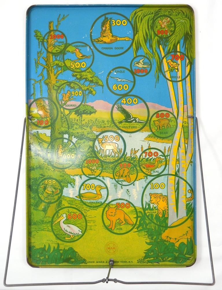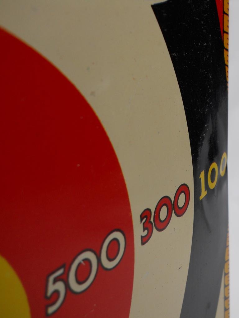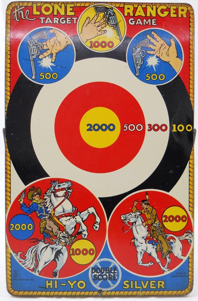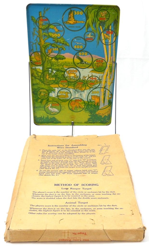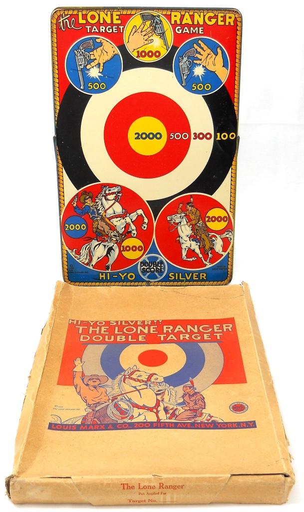 11" x 17". This is a Lone Ranger target; if it had the darts it would be a target game. It was made in 1939 by The Louis Marx & Co. Complete with the original box and a two-sided target. The target is in excellent condition, the box has a top flap missing but can still be filled with styrofoam for display.