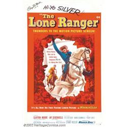 Lone Ranger, The (Warner Brothers, 1956). One Sheet (27" X 41") Clayton Moore became synonymous with the role of the Lone Ranger. The story goes that when hired for the part, he had to teach himself how to talk like the radio character. The series began its run in 1949 and it lasted 169 episodes until its end in 1957. But syndication has kept the program in every home since then. This film was made to cash in on the huge popularity of the TV show and spawned a sequel. Clayton Moore signed this poster in 1979. Very Fine on Linen. Important notice: We expect to be auctioning lots at the rate of 200-250 per hour. Sometimes eBay Premier live bid software cannot keep up with that pace, so we strongly recommend that you place a realistic proxy bid now as insurance to avoid disappointment. Also please note that all Heritage/CAA lots purchased through eBay Premier carry a 20% Buyer's Premium. Please make sure you read the Terms and Conditions.