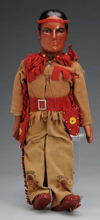Composition head and hands. Original clothing. Marked "Tonto the Lone Ranger's Pal" on both sides of lower pants. Some sort of leather fringe-type clothing is original with original belt, holsters and one gun. Headband still remains. Moderate cracking and crazing throughout head. Condition (Very Good). Size 20" T.