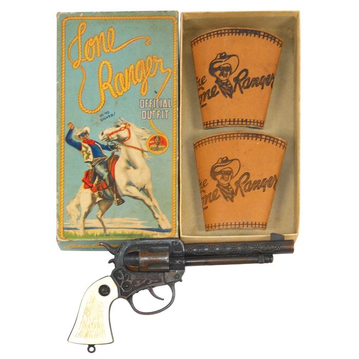Lone Ranger cuff set in box by L.R. Co., Inc. & Lone Ranger cap gun, c.1940's, Exc cond.
