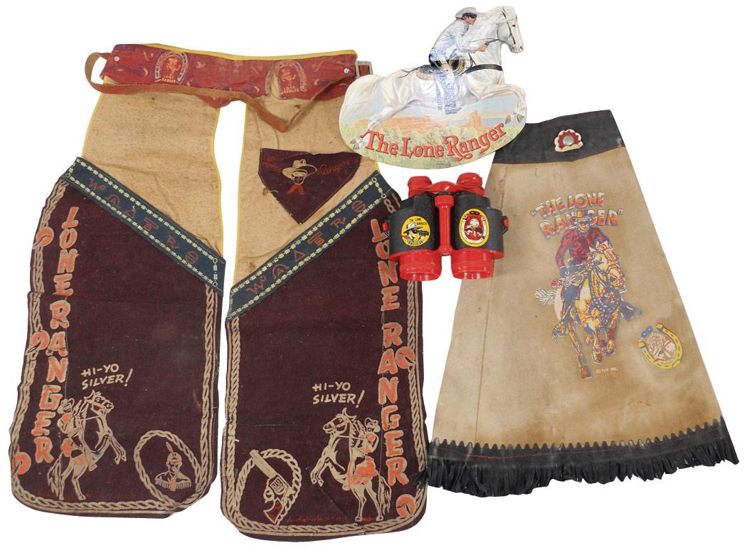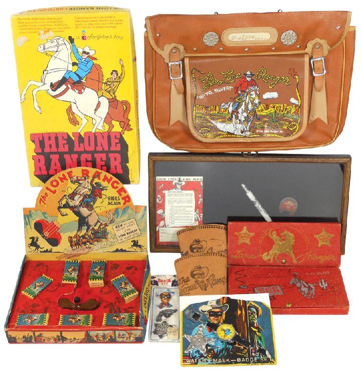 Lone Ranger items (13), includes movie viewer w/films by Cherrio in box, binoculars, 2 pencil boxes, cuff bracelets, school bag, clothing, badge pen, games, watch, etc, c.1940's-1950's, Good to Exc cond.
