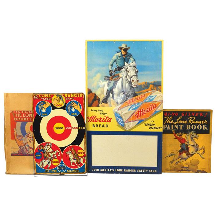 Lone Ranger items, Merita Bread cdbd sign, Lone Ranger Double Target Game in box & Lone Ranger paint book, sign VG cond, other 2 Good cond.