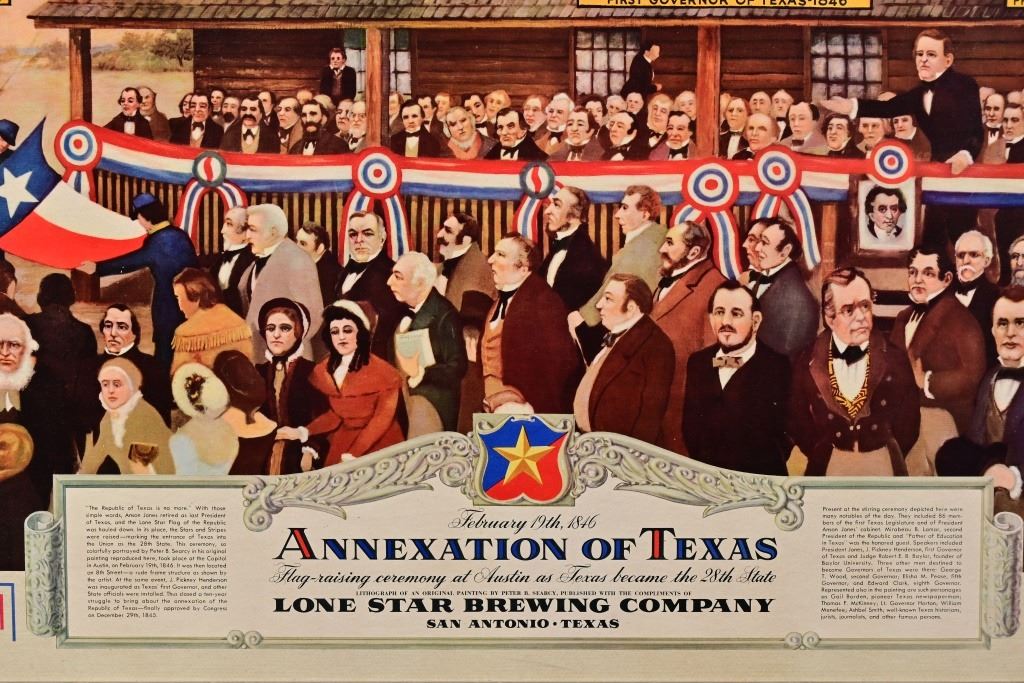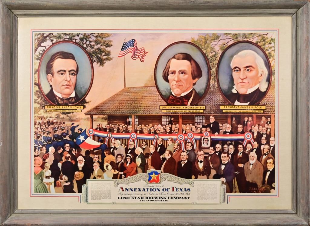 Circa 1946, Lone Star Brewing Co. sign celebrating the 100th anniversary of the Annexation of Texas. Frame measures 32.5" x 44.5"