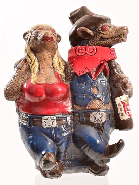 Lone Star Beer Armadillo Couple chalkware statue. This Statue is 8" inches tall, signed "Deep Flex".