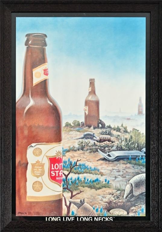 "Long Live Long Necks" No.1 in the series from original paintings by Armadillo Art Squad artist Jim Franklin. Frame measures 24.5" x 35"