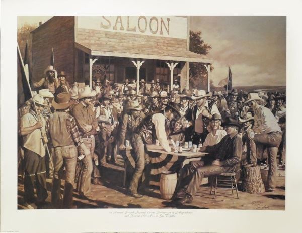 "First Annual Second Signing of the Texas Declaration Of Independence." 1985. 25" x 31-1/2". Artist: Sam Yeates.