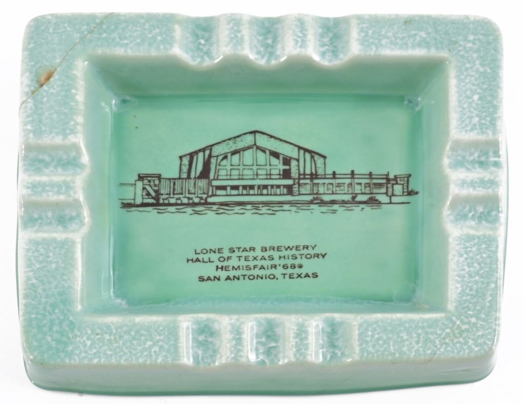 (1) Ceramic Plate San Antonio' Texas 8 1/2". (1) Ashtray Lone Star Brewery, Hemisfair' 68. Hall of Texas History, San Antonio, Texas Approx. 1 1/2" x 6 1/2" x 7 1/2". (1) Hemisfair" 68. Deep In The Heart Of Texas Approx. 1 1/2" x 6 1/2" x 8 1/2".