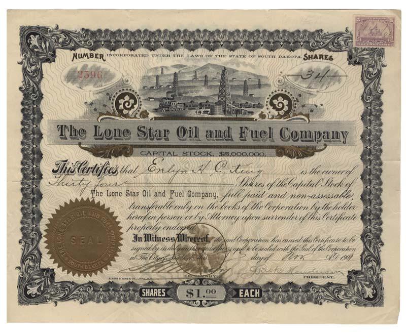 1901, South Dakota. Stock for 34 shares. Black. Large top center engraved vignette on an oil field. Raised gold seal. Revenue stamp at upper right corner. Minor archival tape repair. Uncancelled and fine.