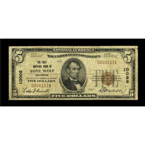 <B>Lone Wolf, OK</B></I> - $5 1929 Ty. 1 <B>The First NB</B></I> Ch. # 10096<BR>This is one of only a literal handful of circulated small notes we've seen from this always sought after location. <B>Very Good.</B></I><BR><I>From The Rolling Plains Collection</B></I><BR><BR><b>Shipping:</b> Coins & Currency (<a target="_blank" href="http://www.heritageauctions.com/common/shipping.php">view shipping information</a>)