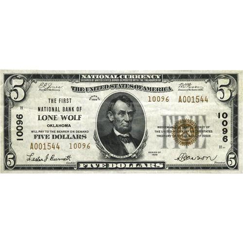 <B>Lone Wolf, OK</B></I> - $5 1929 Ty. 2 <B>The First NB</B></I> Ch. # 10096<BR>Few National Banks were privileged enough to be chartered with a town with a name so appealing. This wholly original note is free of any significant fold or problem. <B>Extremely Fine-About Uncirculated.</B></I>