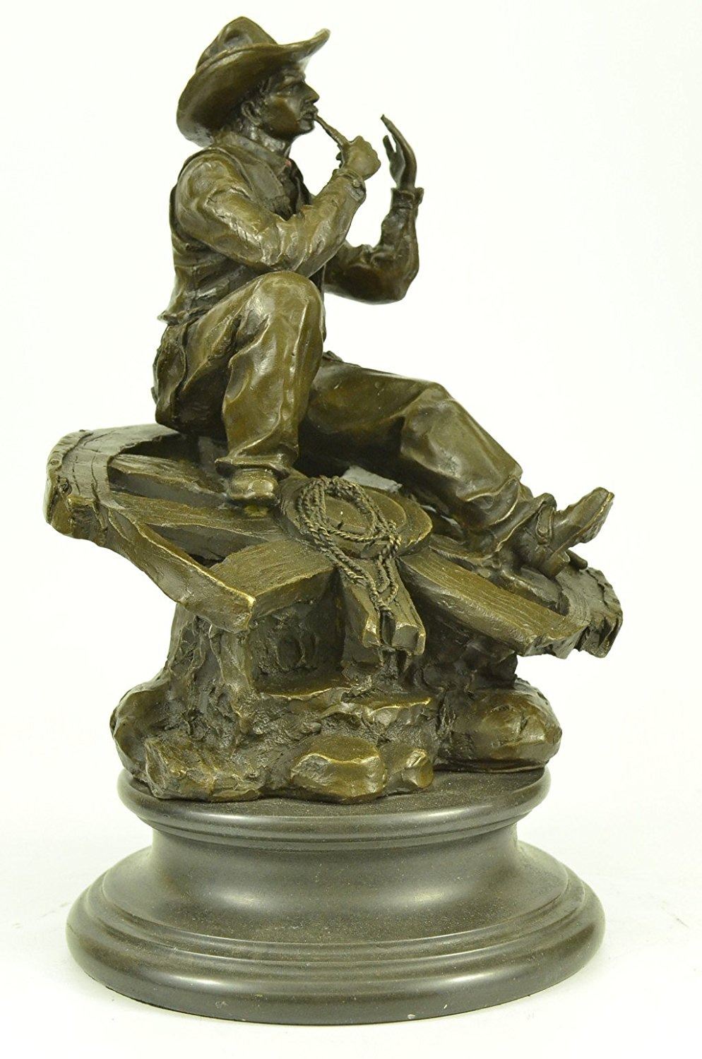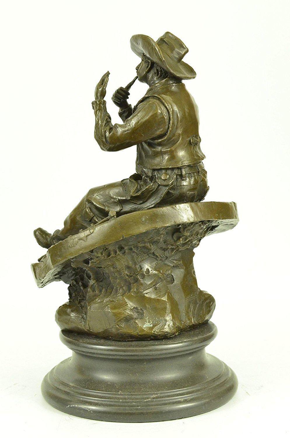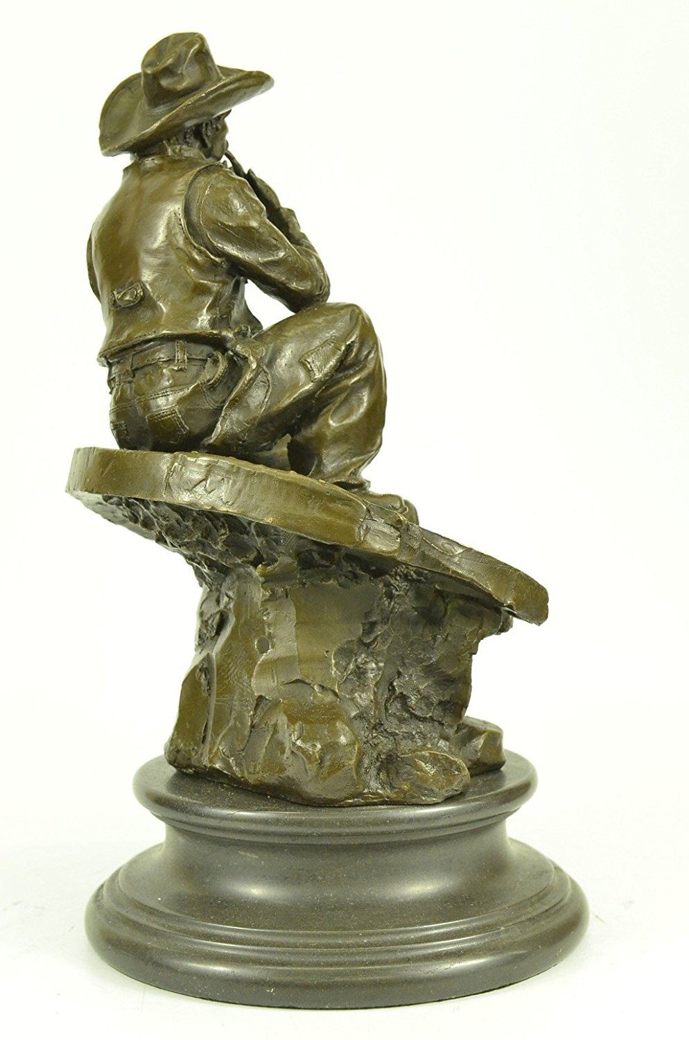 Hand crafted western bronze sculpture, Lonely Cowboy, marked Fisher, depiction of a cowboy sitting and day dreaming lighting his pipe, on a black marble base.The handmade bronze sculpture was molded using the ancient method of lost-wax casting and stained with a brown patina finish for preservation. It is mounted upon a black marble base. Bronze Dimensions with Marble Base: Height 17 X Width 10 inches. Weight: 31 LBS. Inventory: 24YRD115712042