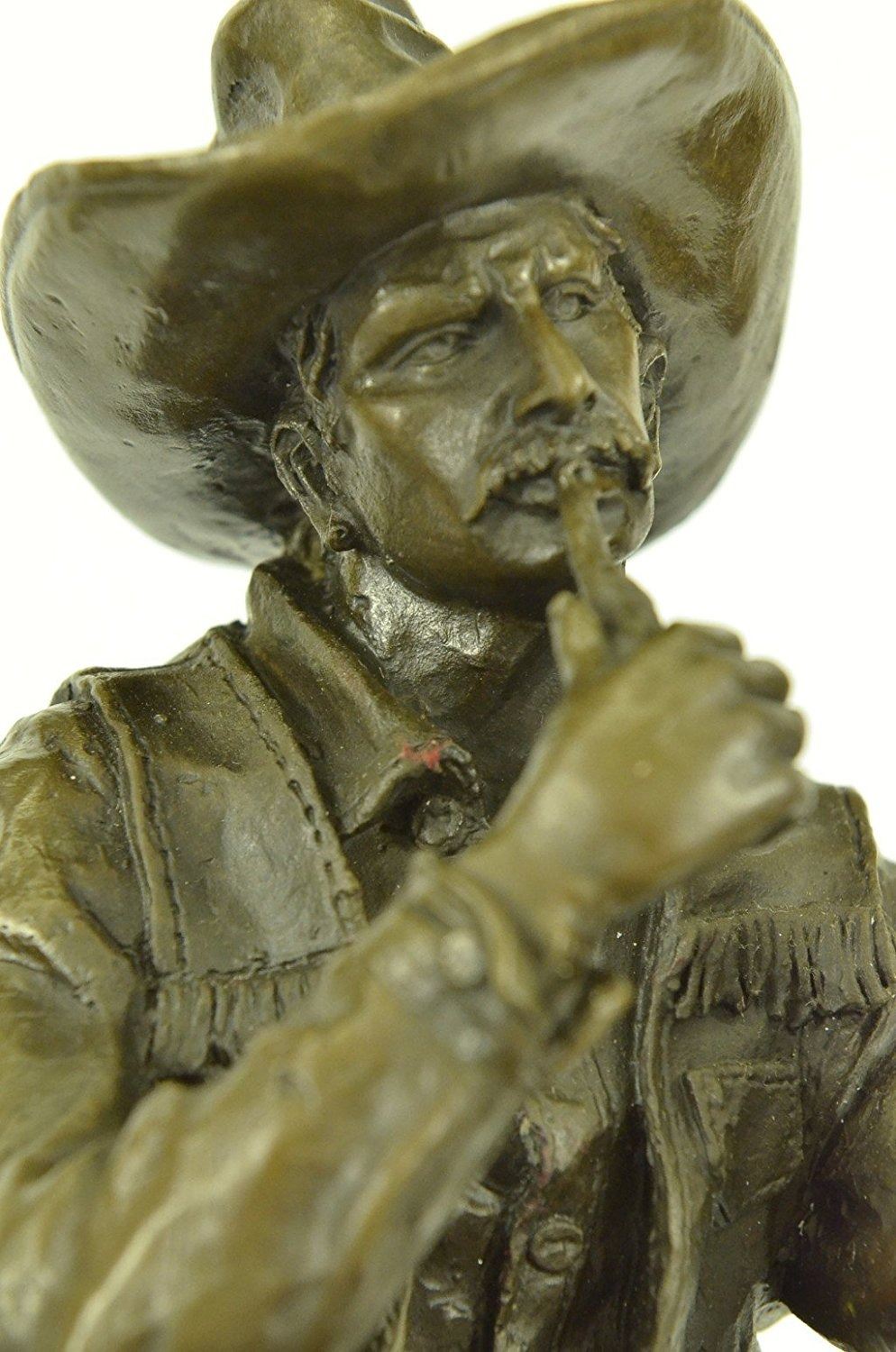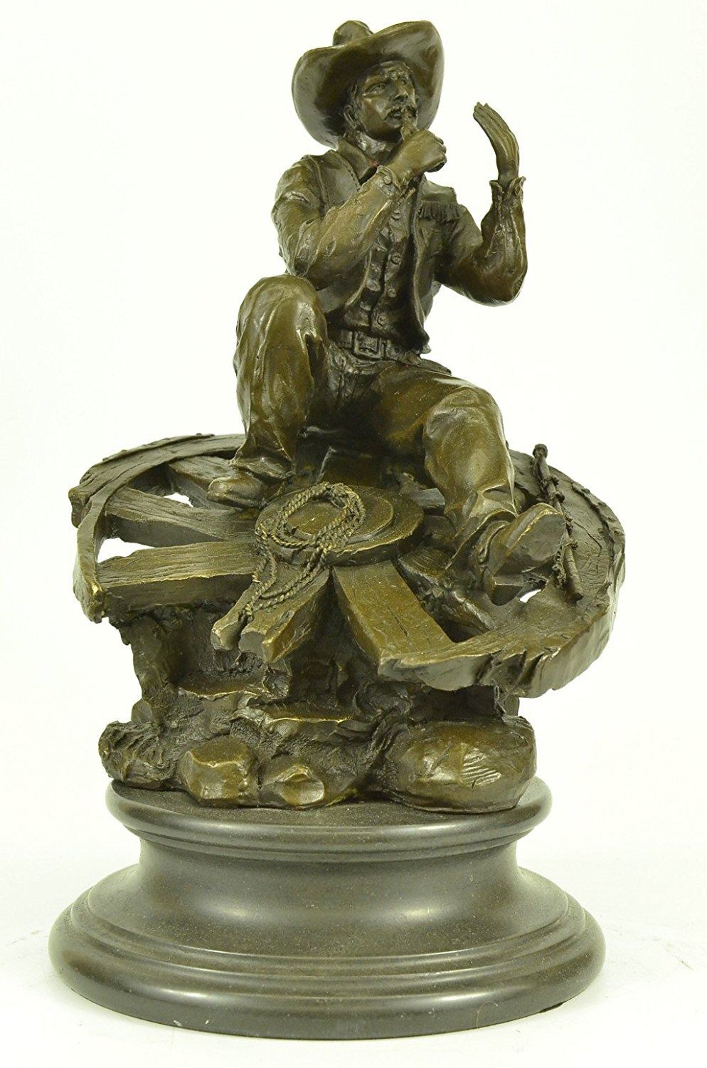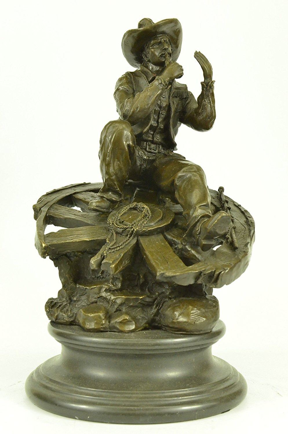 Hand crafted western bronze sculpture, Lonely Cowboy, marked Fisher, depiction of a cowboy sitting and day dreaming lighting his pipe, on a black marble base.The handmade bronze sculpture was molded using the ancient method of lost-wax casting and stained with a brown patina finish for preservation. It is mounted upon a black marble base. Bronze Dimensions with Marble Base: Height 17 X Width 10 inches. Weight: 31 LBS. Inventory: 24YRD115712042