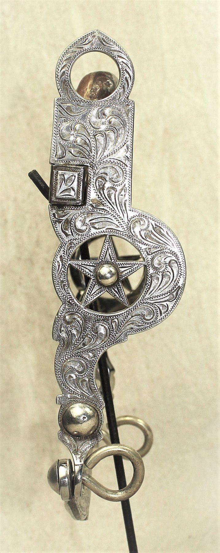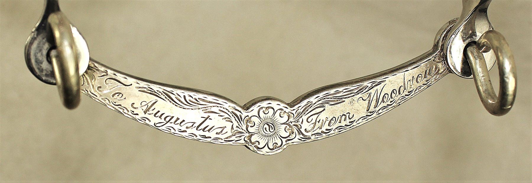 Unmarked California style Elko Star bit, beautiful full coverage engraving, including engraved mouthpiece. Used in the movie Lonesome Dove, inscribed on the back of the lipbar "To Augustus from Woodrow".