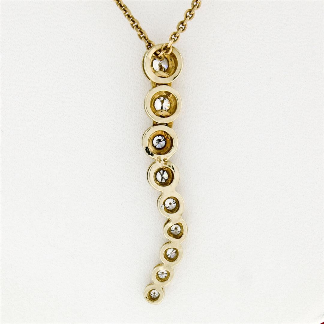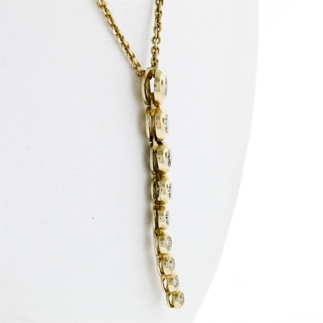 An estate solid 14k yellow gold long journey pendant necklace, with 9 brilliant cut natural diamonds (G- VS1; 0.65ctw). The pendant weighs a total of 5.03 grams, measures 36.40x5.75mm including the bail, and 18 inch cable link chain.