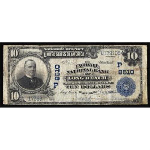 Long Beach, CA. $10 1902 Plain Back. Fr. 626. The Exchange NB. Charter #(P)8510. Very Good.