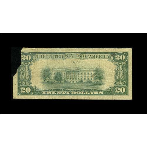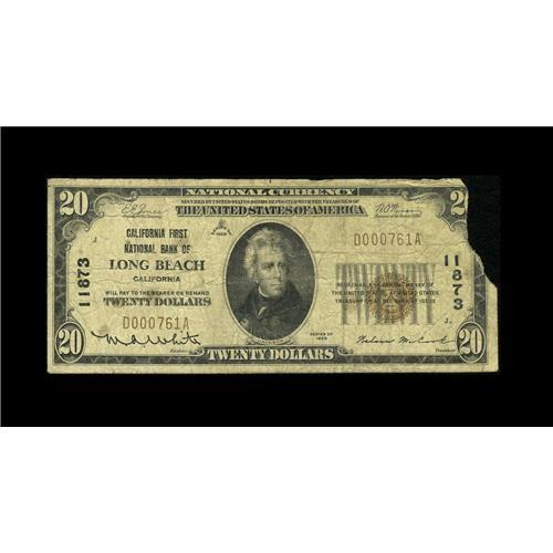 <B>Long Beach, CA</B></I> - $20 1929 Ty. 1 <B>California First NB</B></I> Ch. # 11873<BR>A long, lost issue returns home. Since this note is missing a piece there will be no returns for any reason. <B>Good-Very Good.</B></I>