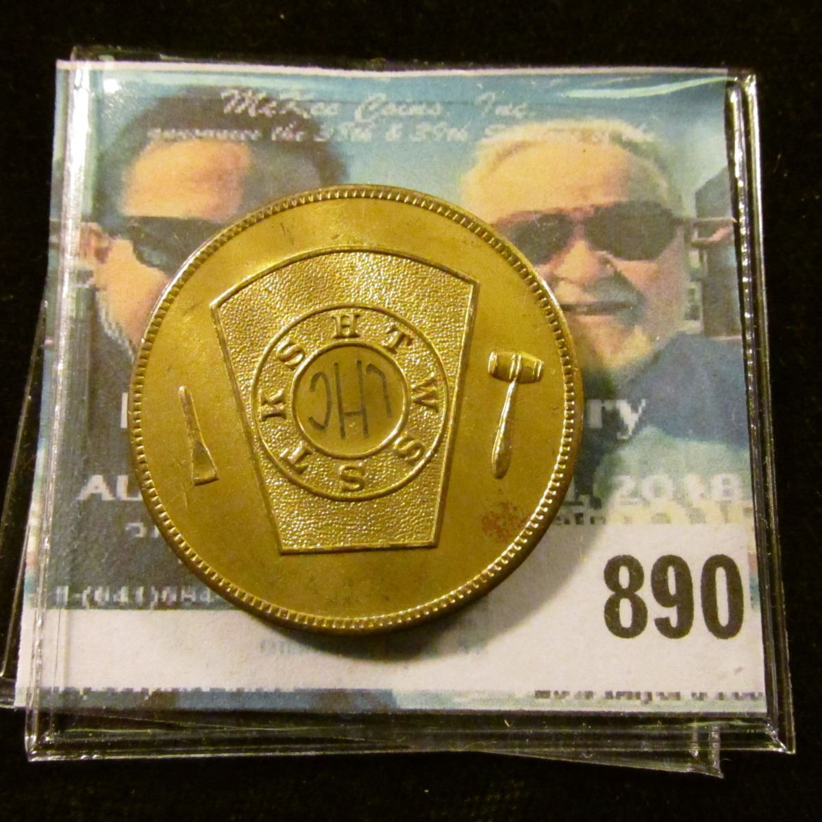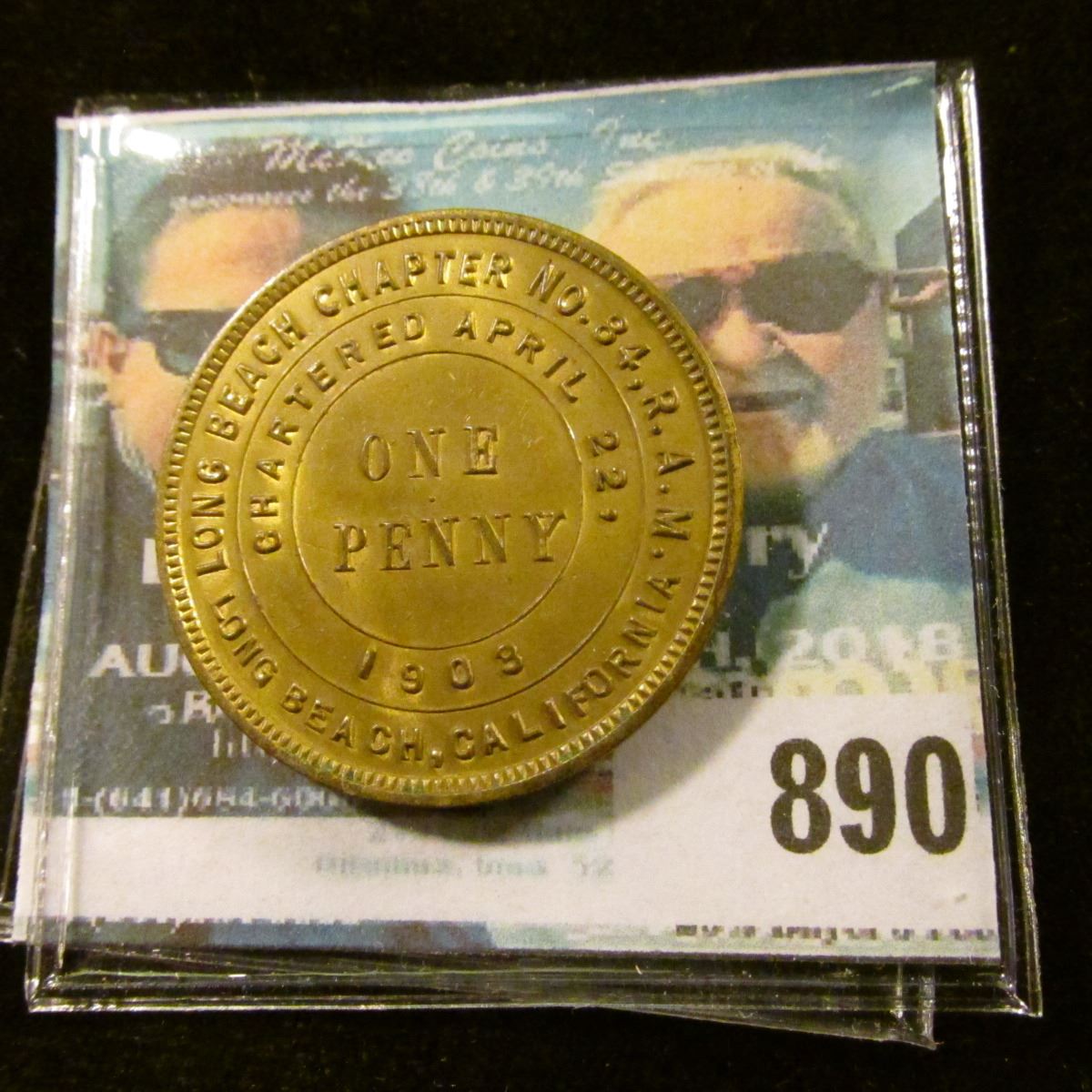 "Long Beach Chapter No.84, R.A.M./Chartered April 22, 1908/One/Penny/Long Beach, California", reverse "KSHTWSST", Masonic Penny, Choice AU.