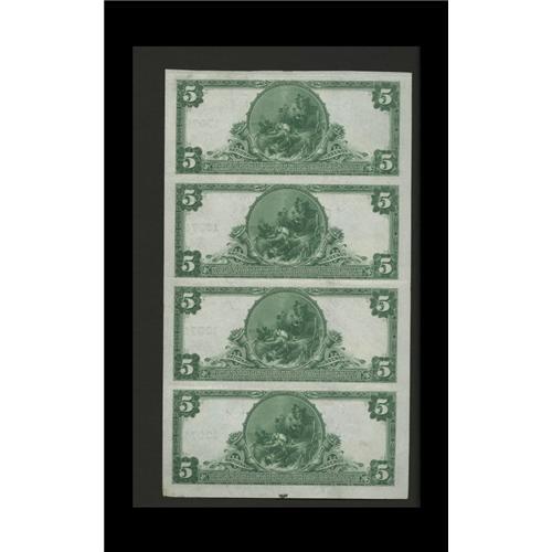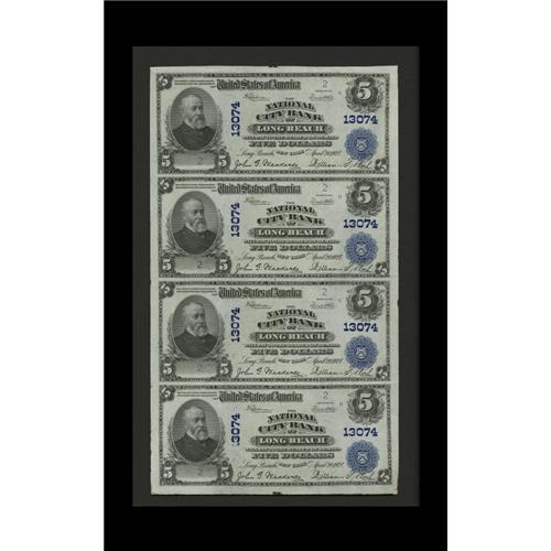 <B>Long Beach, NY</B></I> - $5 1902 Plain Back Fr. 609 <B>The National City Bank</B></I> Ch. # 13074 Uncut Sheet<BR>A very pretty uncut sheet from this scarce late charter Nassau County bank, with each note bearing low serial number 2. Four sheets are known from here, one of which is rumored to have been cut, and single notes are quite scarce as well. There are light folds in the selvage and between the notes, and a few specks around the edges, but the overall appearance is quite attractive. <B>Choice About Uncirculated.</B></I><BR><I>From The Plymouth Rock Collection</B></I>