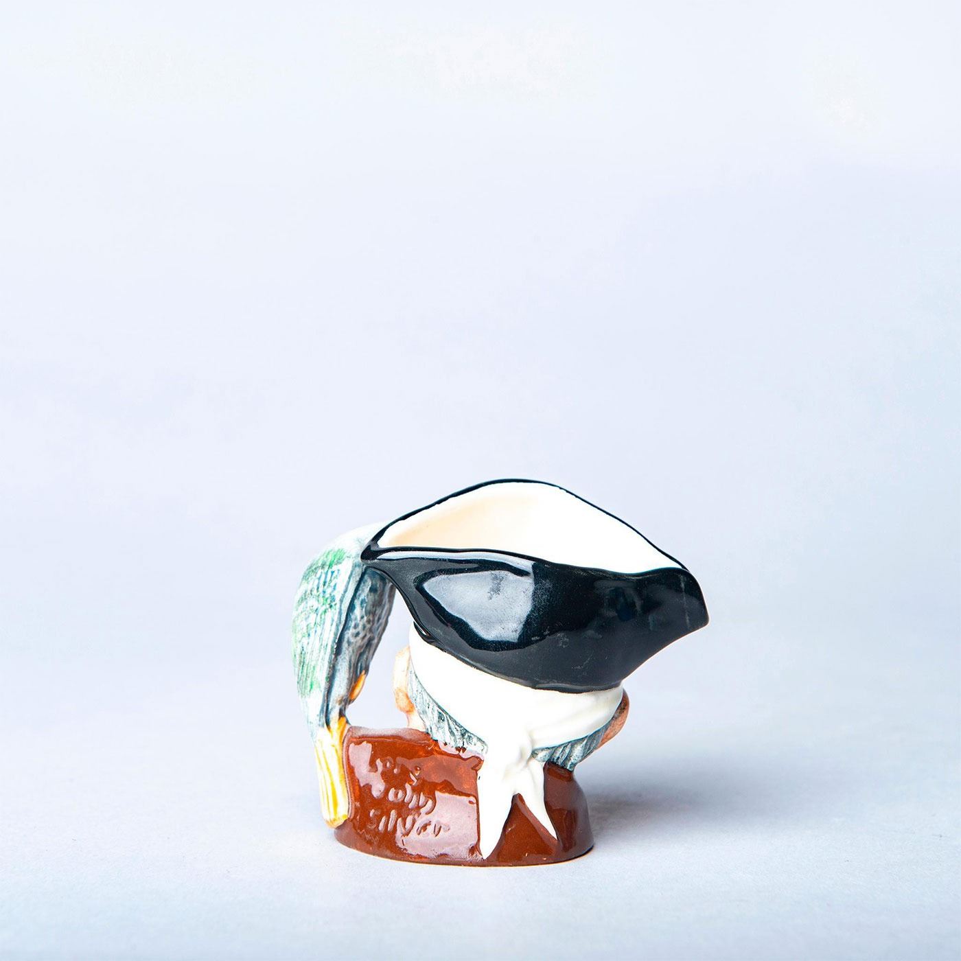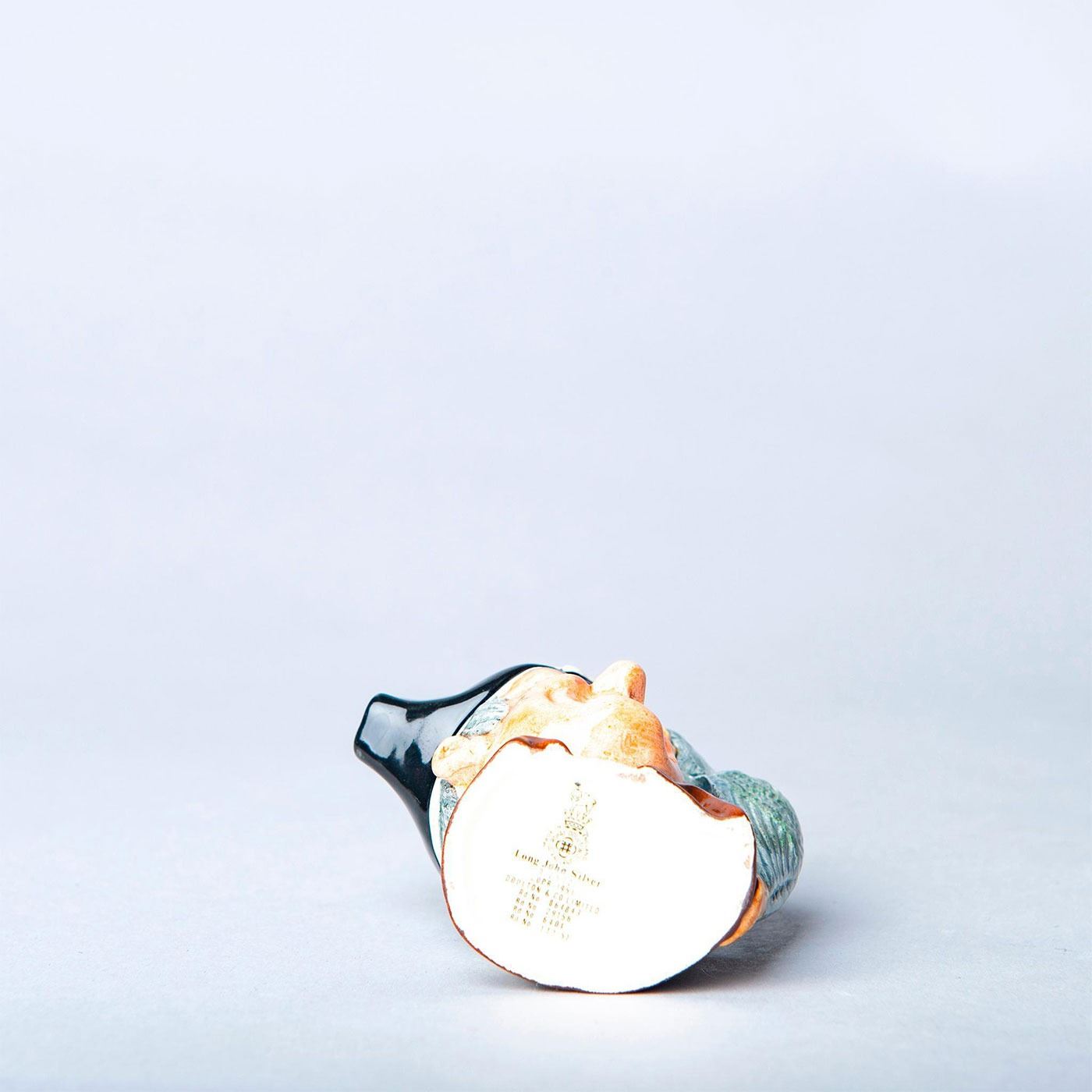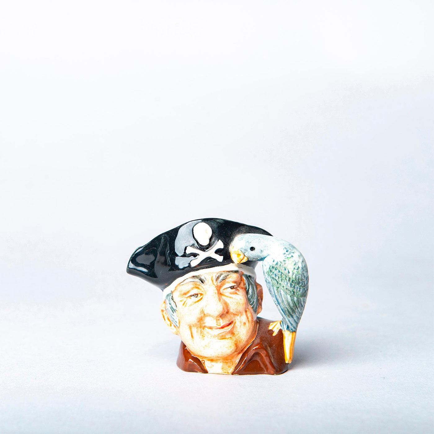 Royal Doulton Character Jug, Long John Silver D6512 (maroon shirt; green and grey parrot). Designed by Max Henk. Series: Characters from Literature, issued 1960 1991. Size: 2.5"H (mini) This scoundrel and pirate from Robert Louis Stevensons Treasure Island had a wooden leg and a parrot companion. Together with the boy-hero Jim Hawkins, he set sail in a hair- raising search for buried treasure. Royal Doulton backstamp.