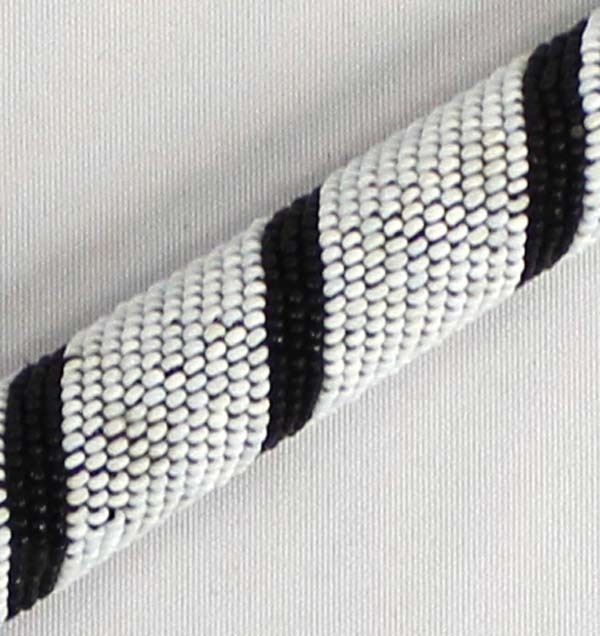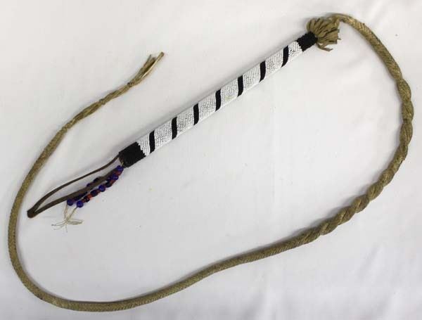 Long Native American Plains Indian Beaded Leather Whip, measures 60''L including hangle, embellished with two strands of cobalt blue trade beads