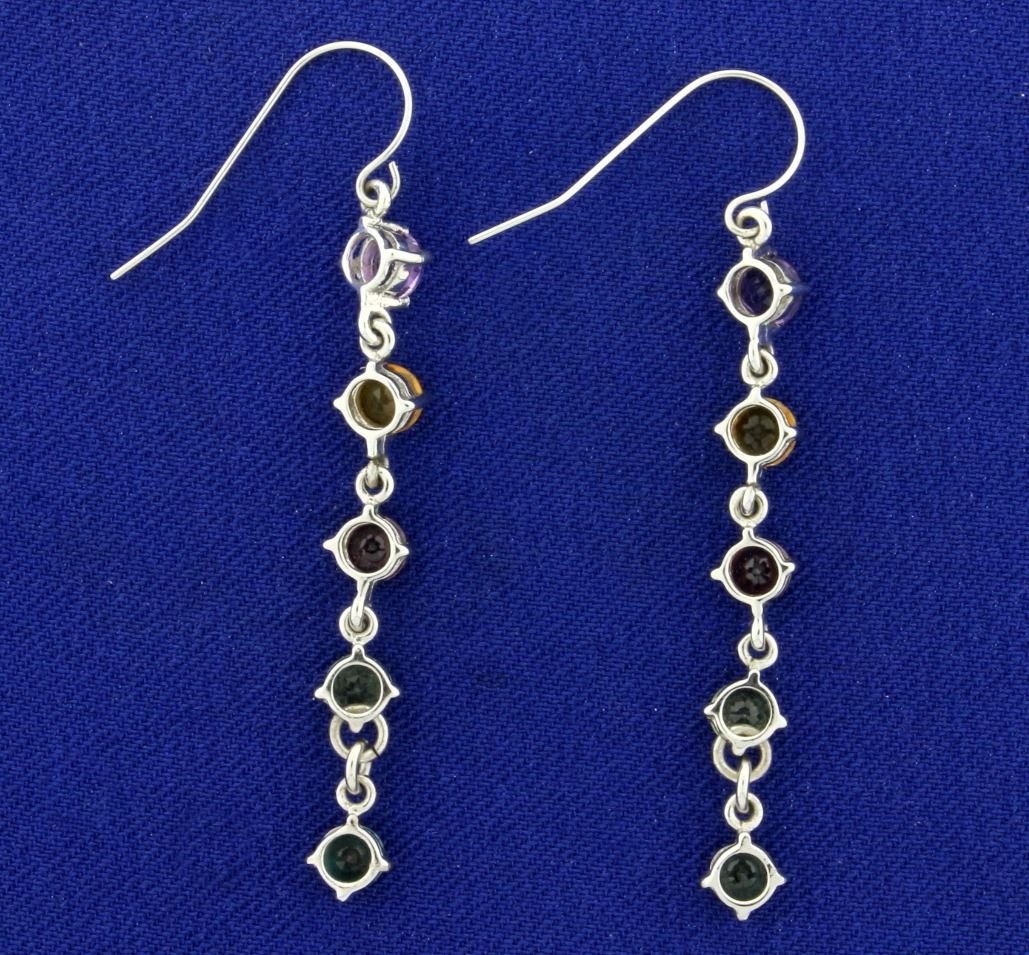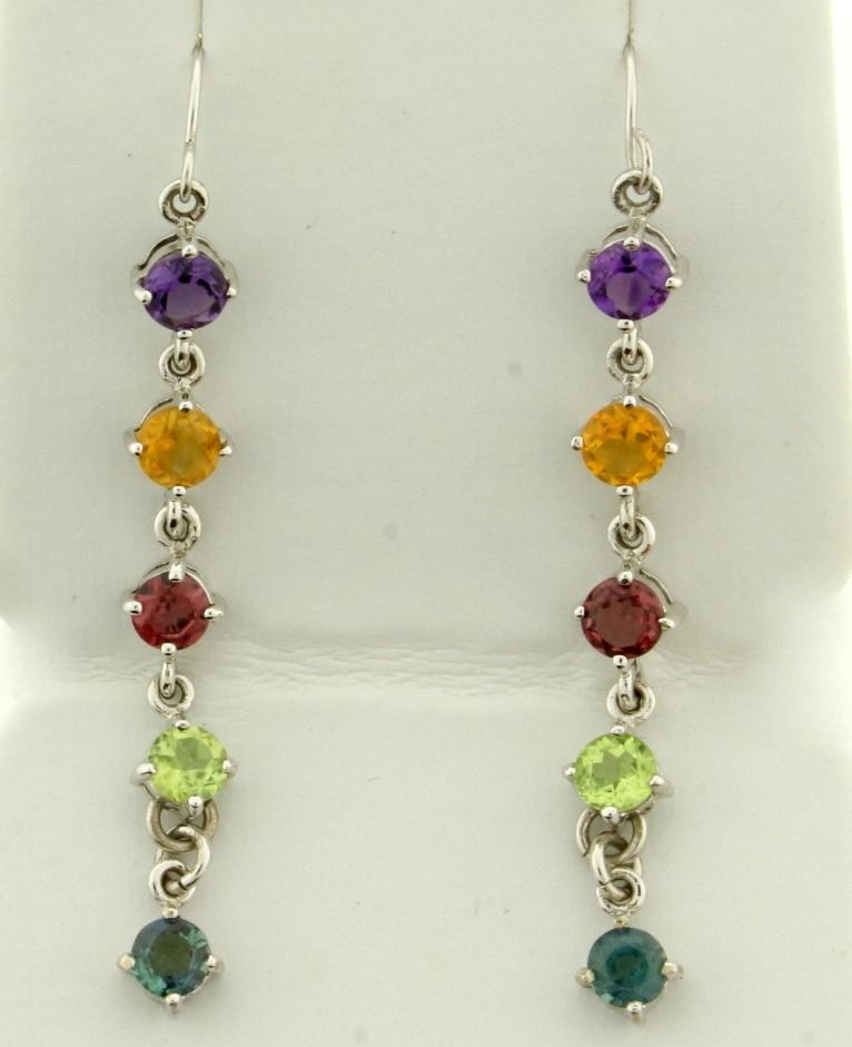 In 14K White Gold. 2 inches long. Each earring contains five 4mm high quality natural gemstones with bright vibrant color and excellent clarity: Amethyst, Citrine, Garnet, Peridot, and Green Topaz. Ear wire hooks for pierced ears. 2.9g