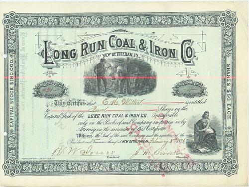1886, Pennsylvania. Stock certificate for 4 shares. Gray/Black. Vignette at top center of miners at work and female allegorical figure at lower right. Stamp and punch cancelled. Very fine.