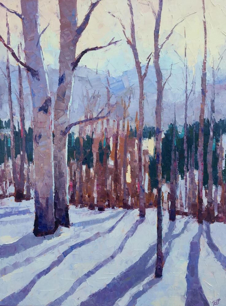 Artist: Kara Tripp. Title: Long Shadows. Size: 40" x 30". Medium: Oil. Description: "The sun low on the horizon casts long shadows onto the snowy ground. I love the yellow hues in the sky, warming this winter scene." -KT