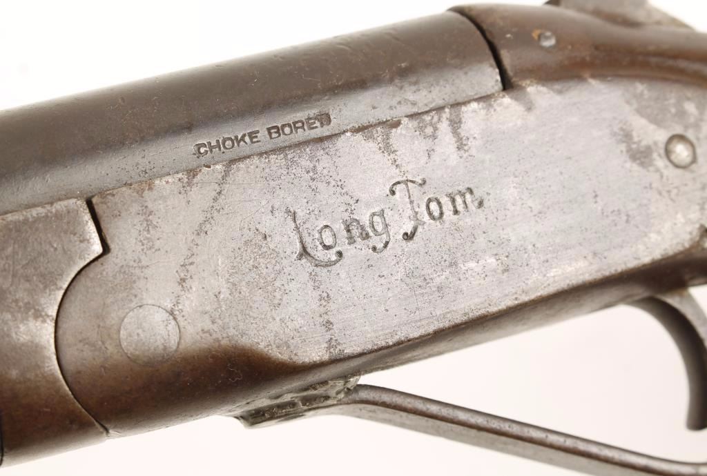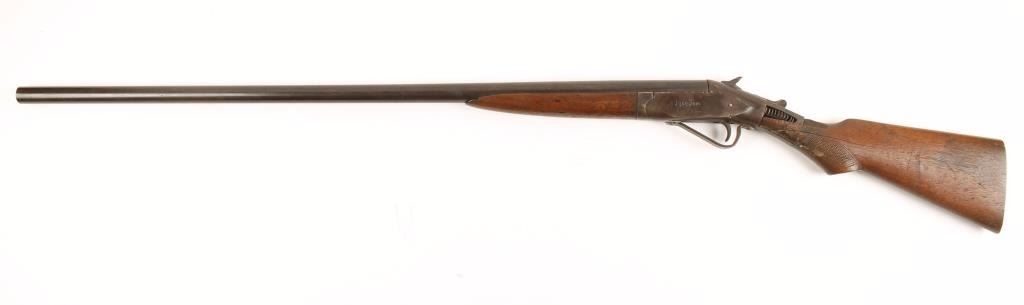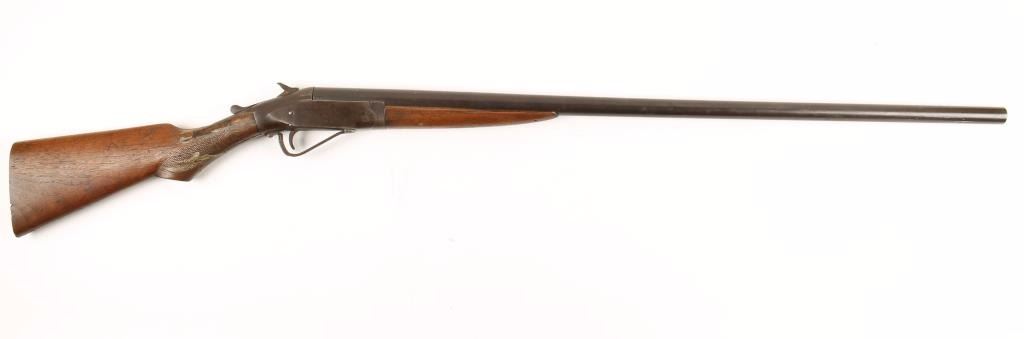 Single shot break action long barrel shotgun chambered for 12 Gauge shells, circa 1900"s. Features a fully blued finish, cut-down 34" barrel, no front sight, steel receiver, checkered hammer spur, smooth trigger, repaired trigger guard, plain forend and checkered pistol grip shoulder stock with no buttplate. Finish has turned to an even black/brown patina. Stock is severely damaged at wrist. Bore is lightly pitted but retains some brightness. Condition is good as a wall-hanger. ***Modern Firearm***