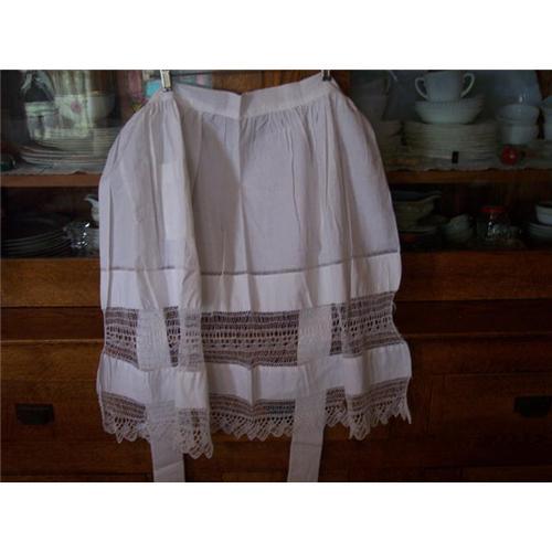 This is a beautiful apron.Only flaw is one tiny pin hole towards top that would be easy to repair.I do not know what kind of needlework is on this apron but it is just beautiful.Measures 26 1/2" long.Has the same needlework on the ends of the ties.