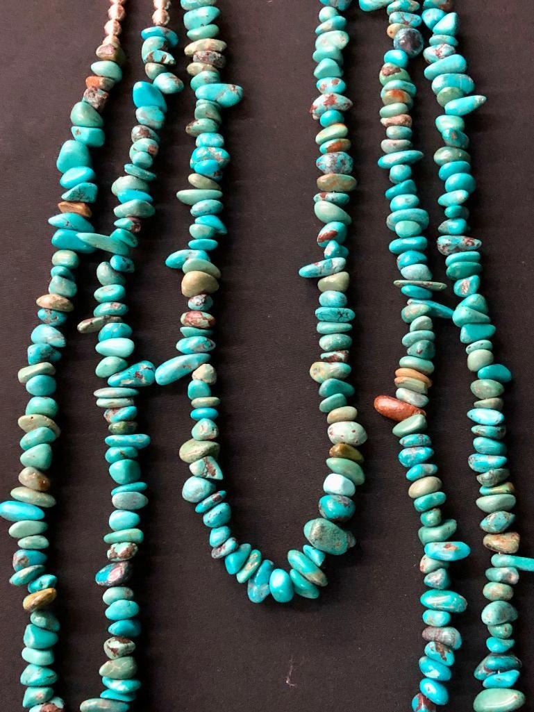 Presented for sale in this lot is a long and alluring three strand turquoise necklace. This is an eye catching statement piece as well! This multi strand necklace is strung with great turquoise beads highlighted with silver bead accents and findings. It is stamped as sterling and has a substantial weight to it. MAKER/ARTIST: Hallmarked MS. APPROX AGE: Circa 1970s. SIZE: To the shortest strand fits a 27 inch neck. Over all length is 48 inches long. Weighs 502 grams. CONDITION: Good for its age, normal wear expected. Please look closely at the pictures as they are an important part of our description and are hereby incorporated into the description, specifically with regards to condition. SHIPPING: There will be a $5 handling / packaging fee for shipping this lot. The actual cost of postage will be added on top of that. BUY IT NOW: If you would like to buy this item now, without waiting for the auction day to bid on it, we do offer this option (which is available up to 48 hours before the actual auction starts). The “Buy it Now†price is the high estimate of this lot (plus applicable fees and the Buyer's premium is discounted to 10% when using the Buy it Now option). If you would like to exercise this option, you must contact us by email (or phone as long as you talk to someone live). Reference this lot number and your intention to "Buy it Now."
