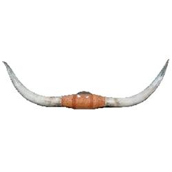 Long horned steer horns, tooled leather center, VG condition, 70"L.