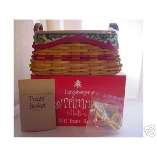 Longaberger® Original Tree Trimming Series 2002 TREATS Christmas Basket Set. This is the little basket in the Tree Trimming Series, complete with box, basket, American Holly liner, protector, product card, tie on and wood craft lid. A wonderful basket to use at Christmas time or give as a gift.