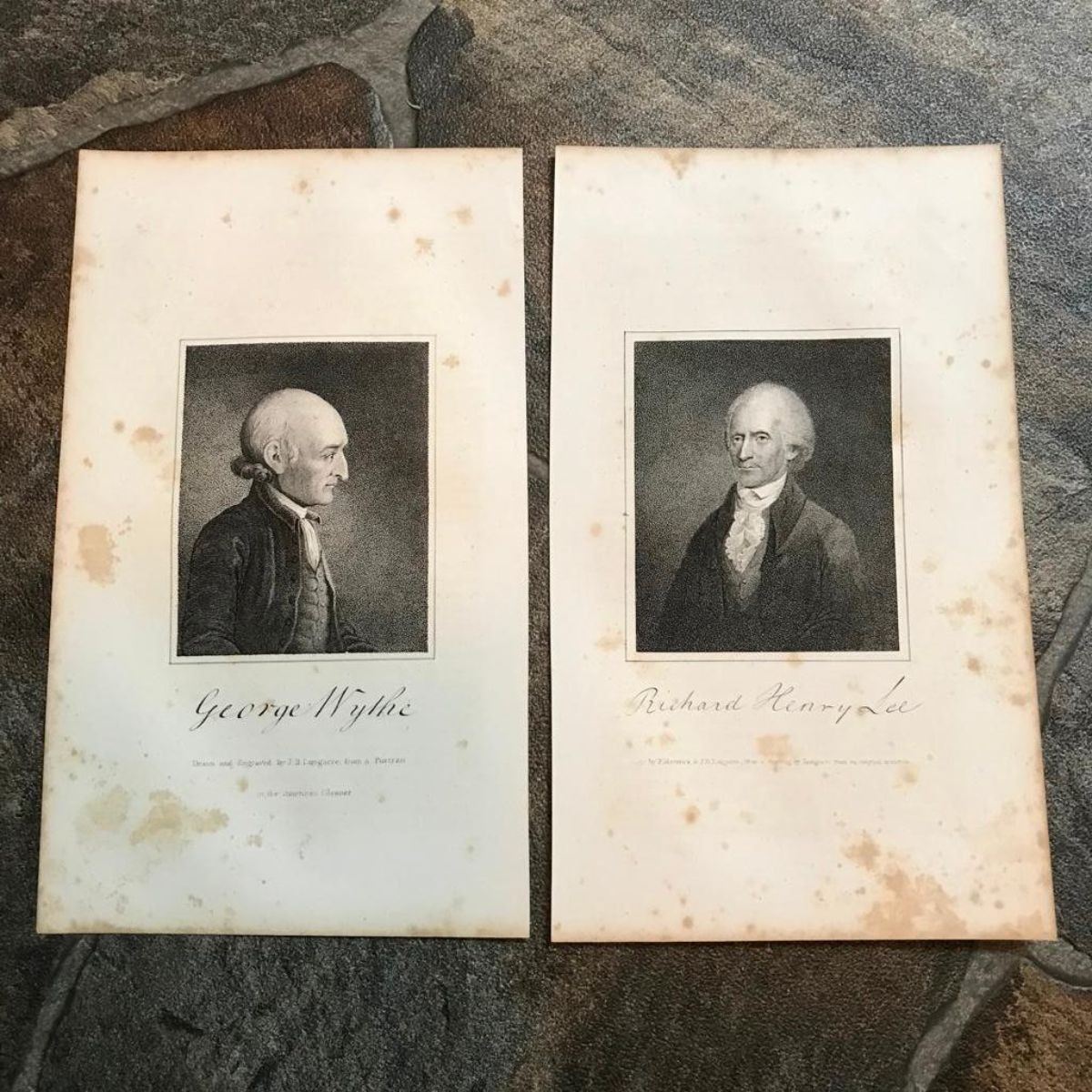 Two engravings of 19thc Virginia statesmen, signatories of The Declaration of Independence, Richard Henry Lee & George Wythe. From an 1846 history book, engraved by & from the original drawings by J. B. Longacre. 5 1/2" X 9" each. * heavy foxing to margins due to age, as seen in photos. George Wythe ( 1726-1806 ) was the first American law professor, a noted classics scholar, & a Virginia judge. The first of the seven Virginia signatories of the United States Declaration of Independence, Wythe served as one of Virginia's representatives to the Continental Congress and the Philadelphia Convention. Richard Henry Lee ( 1732 - 1794 ) was an American statesman & Founding Father from Virginia best known for the June 1776 Lee Resolution, the motion in the Second Continental Congress calling for the colonies' independence from Great Britain leading to the United States Declaration of Independence, which he signed.