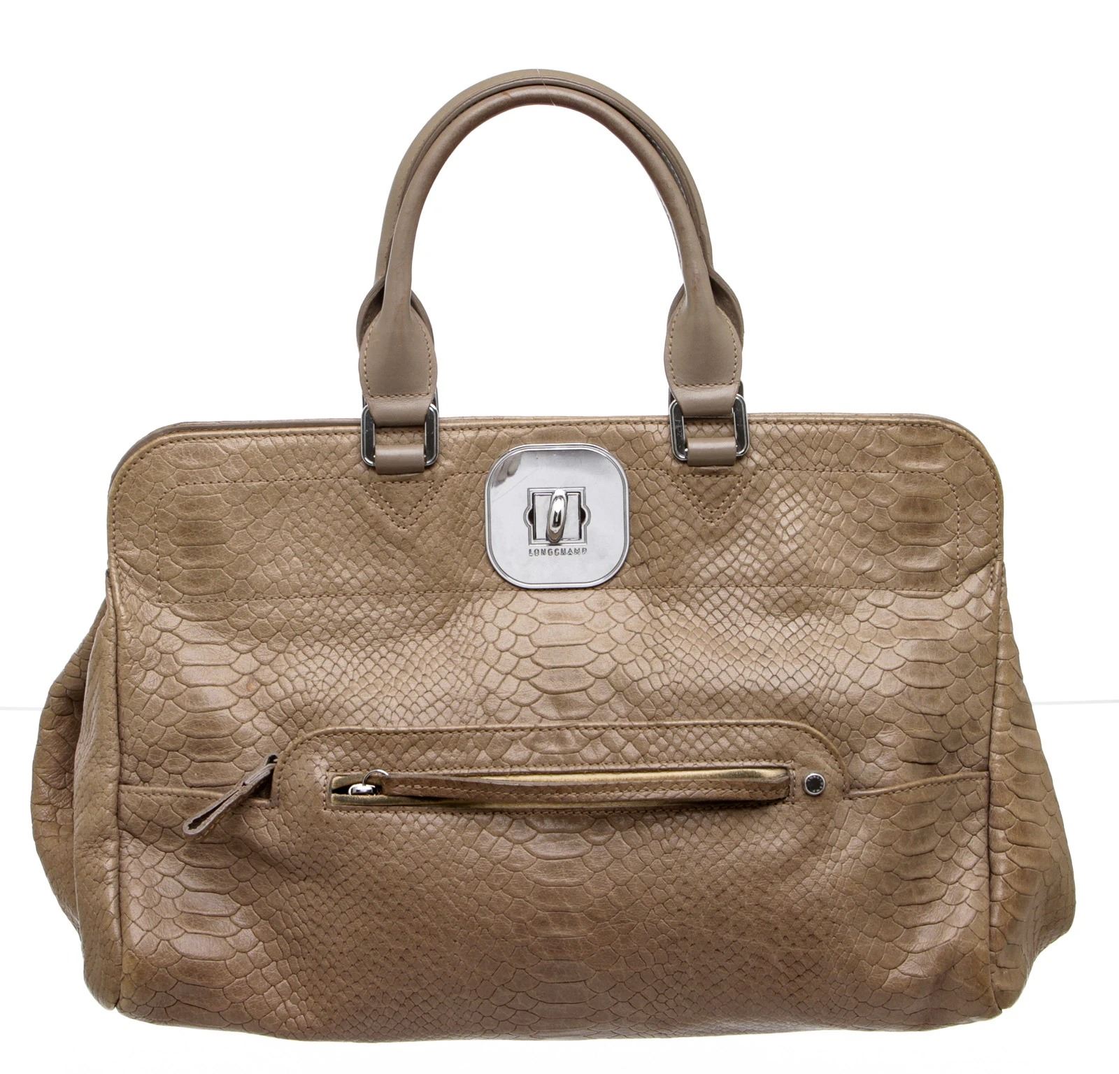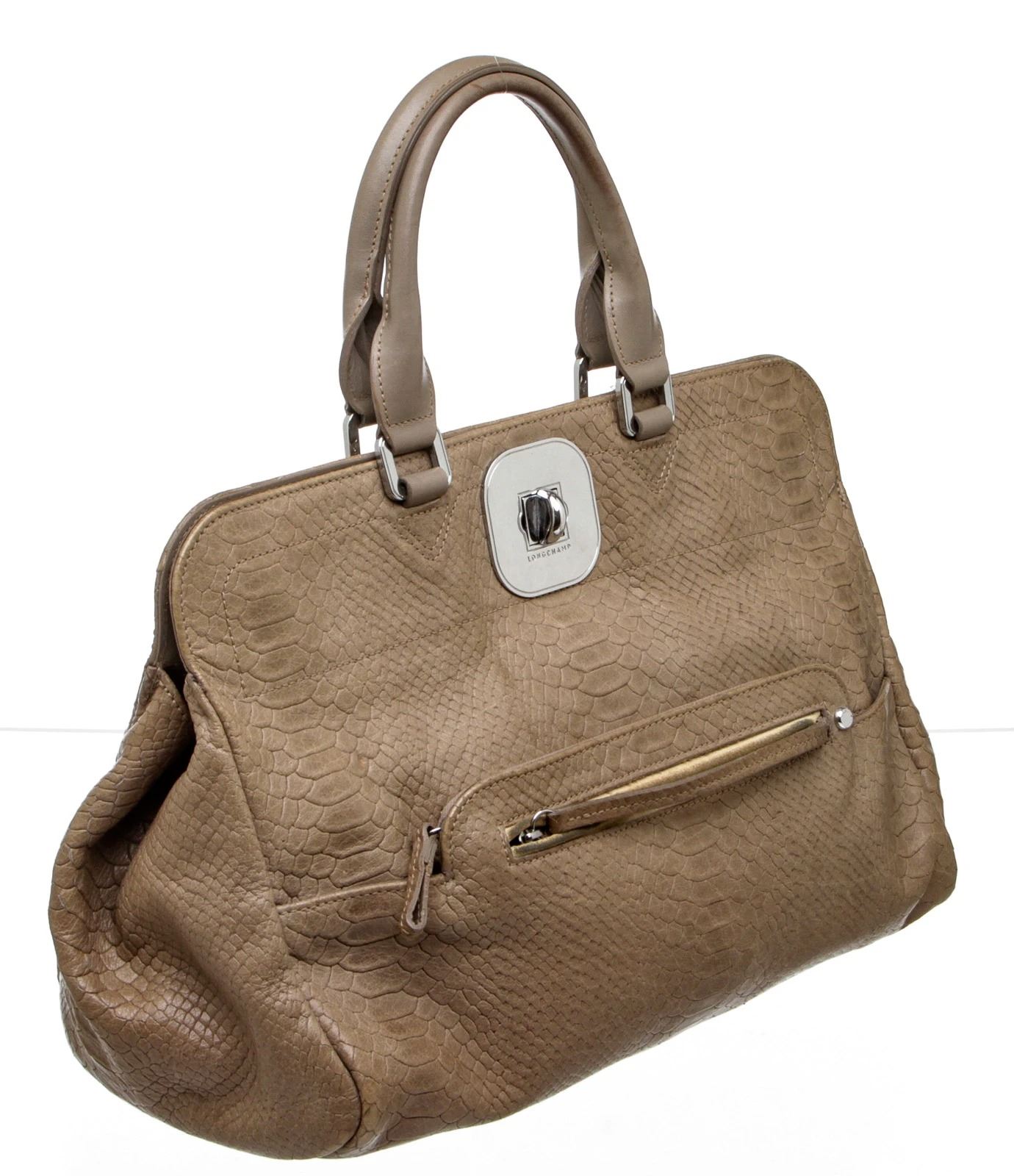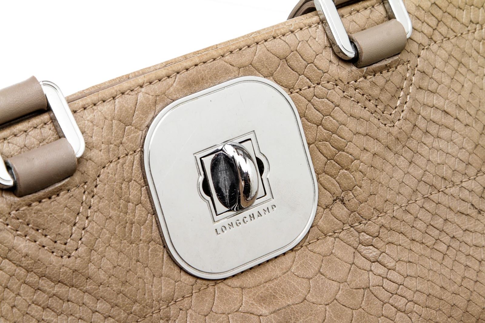 This Longchamp taupe embossed leather Gatsby handbag features two leather handles, detachable cross body strap, twist lock closure, two front compartments with zipper closures, single zip pocket on interior wall, two single slit pockets on opposite interior wall, key ring strap, print fabric lining, and silver tone hardware.