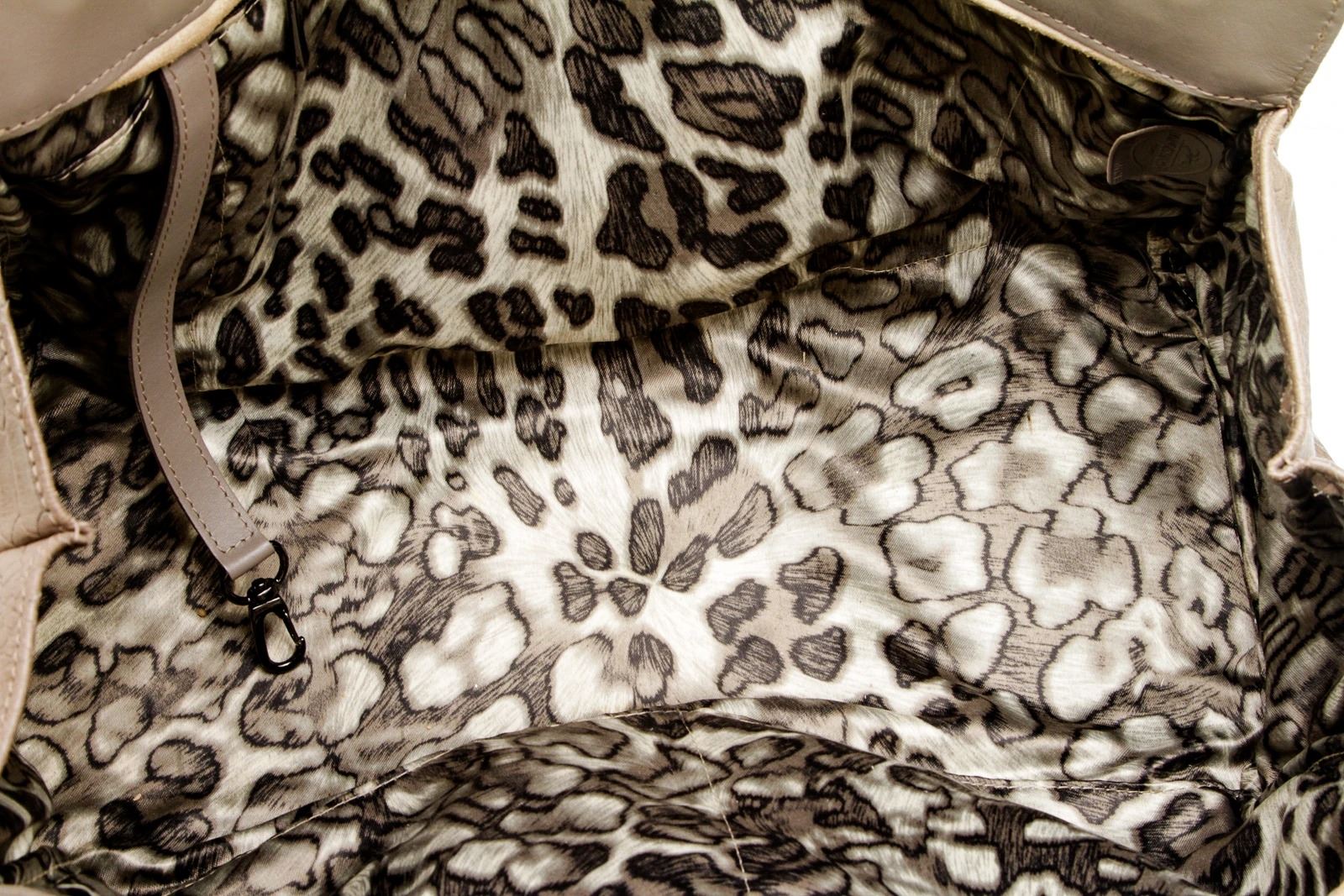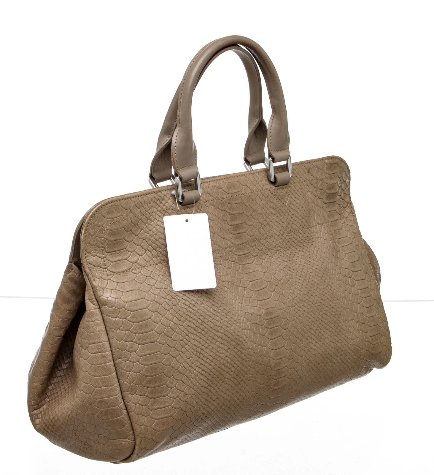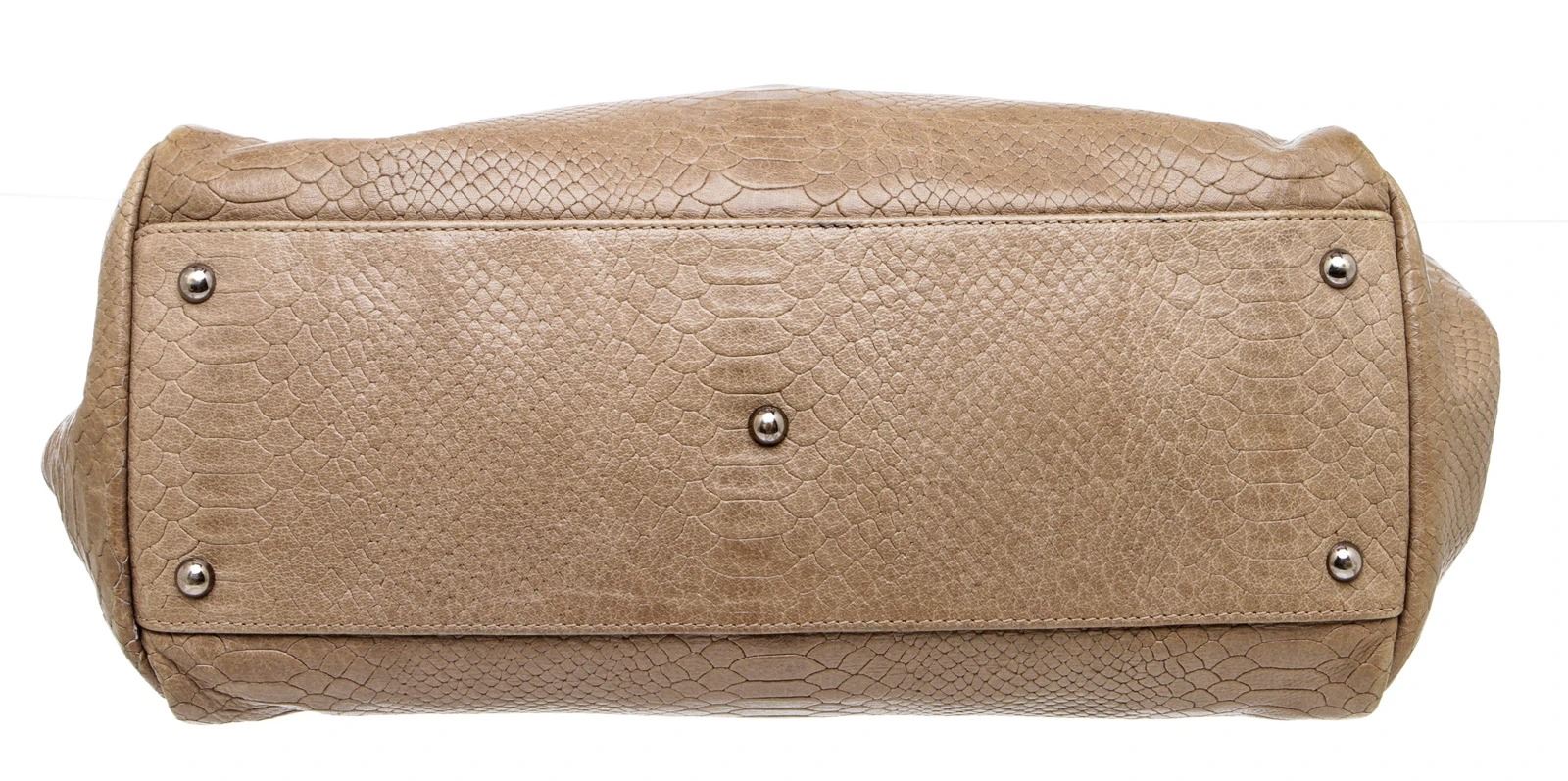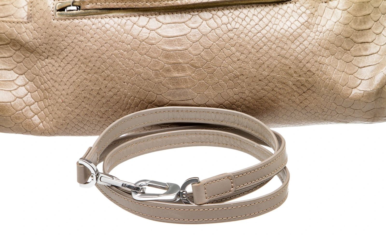 This Longchamp taupe embossed leather Gatsby handbag features two leather handles, detachable cross body strap, twist lock closure, two front compartments with zipper closures, single zip pocket on interior wall, two single slit pockets on opposite interior wall, key ring strap, print fabric lining, and silver tone hardware.