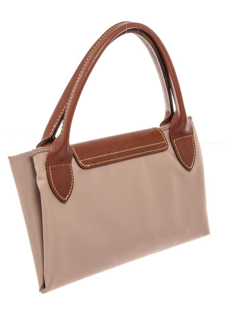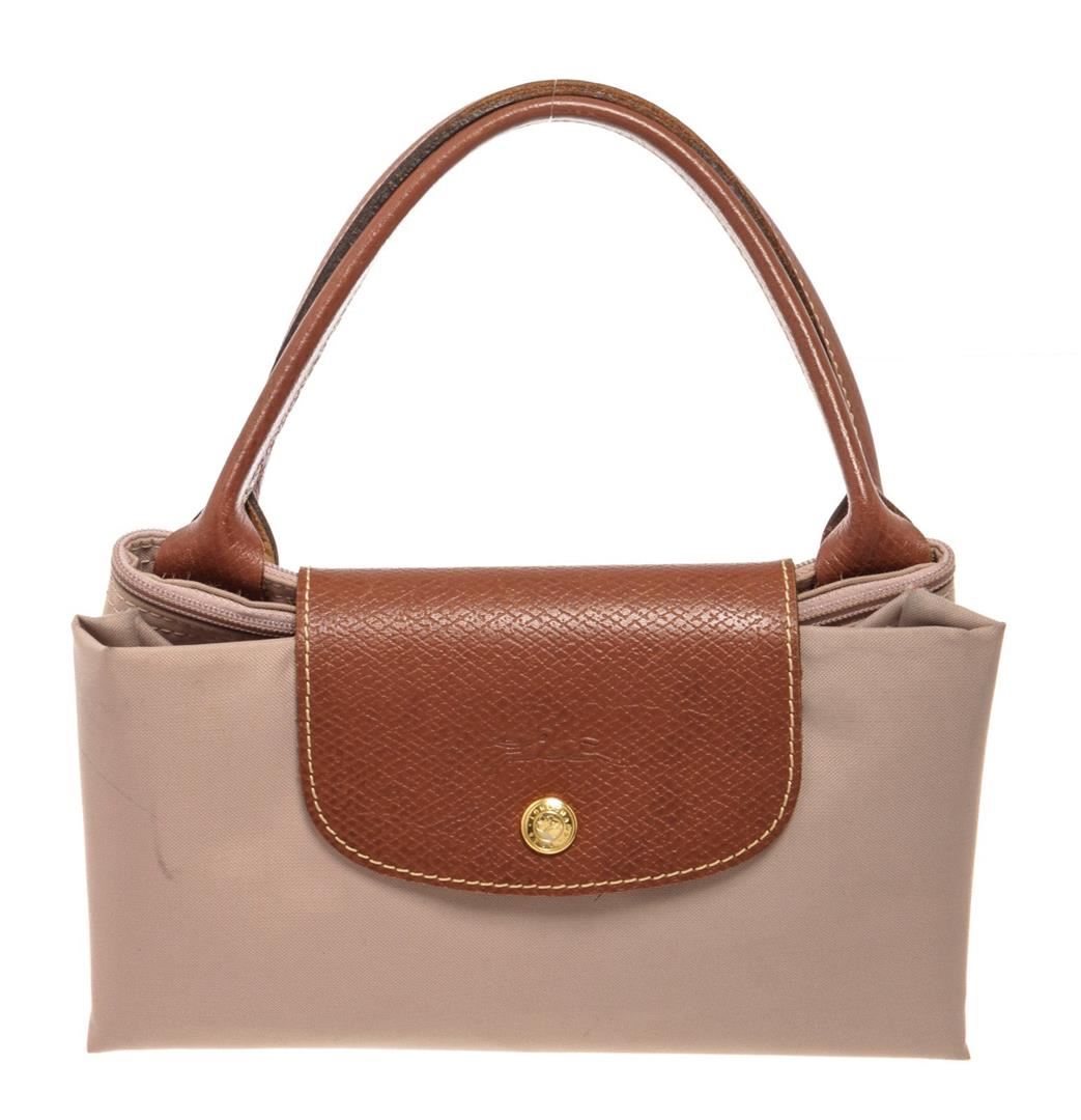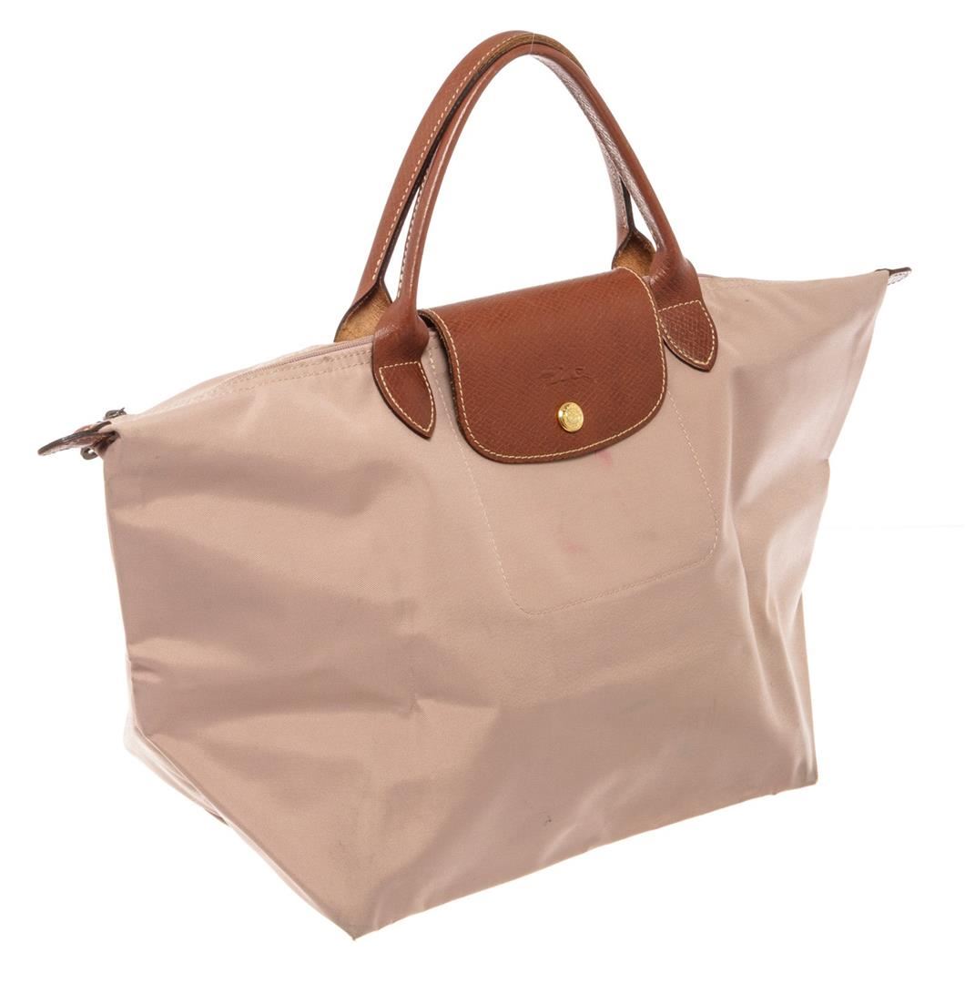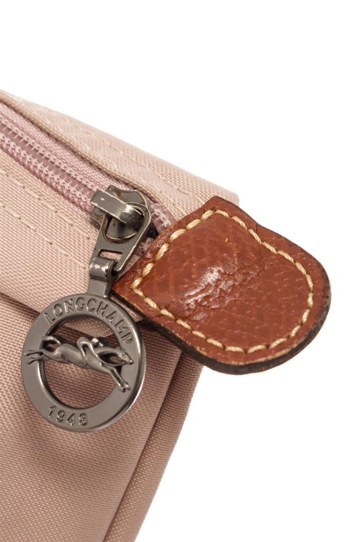 Longchamp Light Pink Nylon Le Pliage Medium tote bag with gold-tone hardware, zipper on top of the main compartment, fabric interior lining, one slip pocket at interior wall and double brown leather top handles. 11.75" x 2.25" x 5.75"