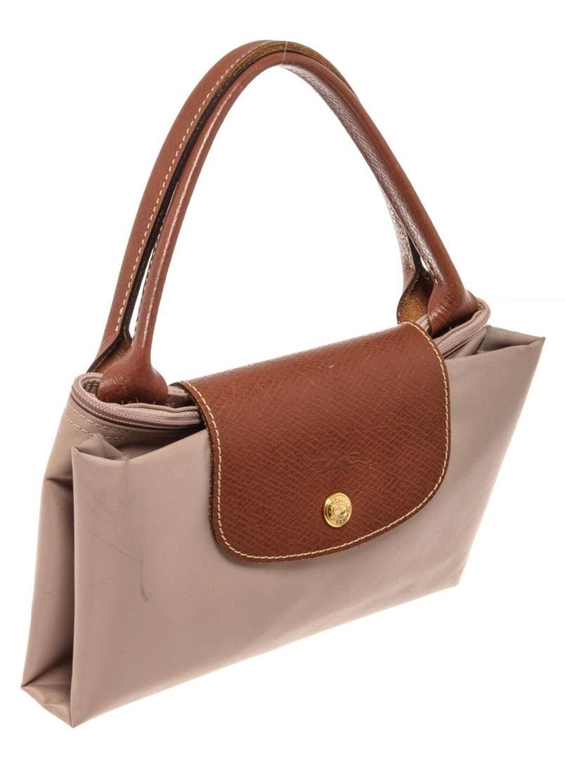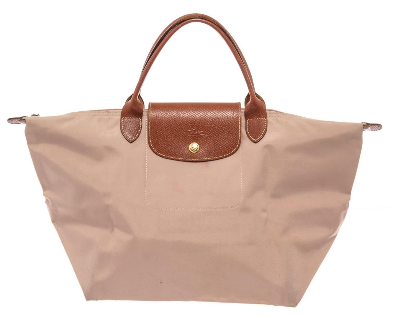 Longchamp Light Pink Nylon Le Pliage Medium tote bag with gold-tone hardware, zipper on top of the main compartment, fabric interior lining, one slip pocket at interior wall and double brown leather top handles. 11.75" x 2.25" x 5.75"