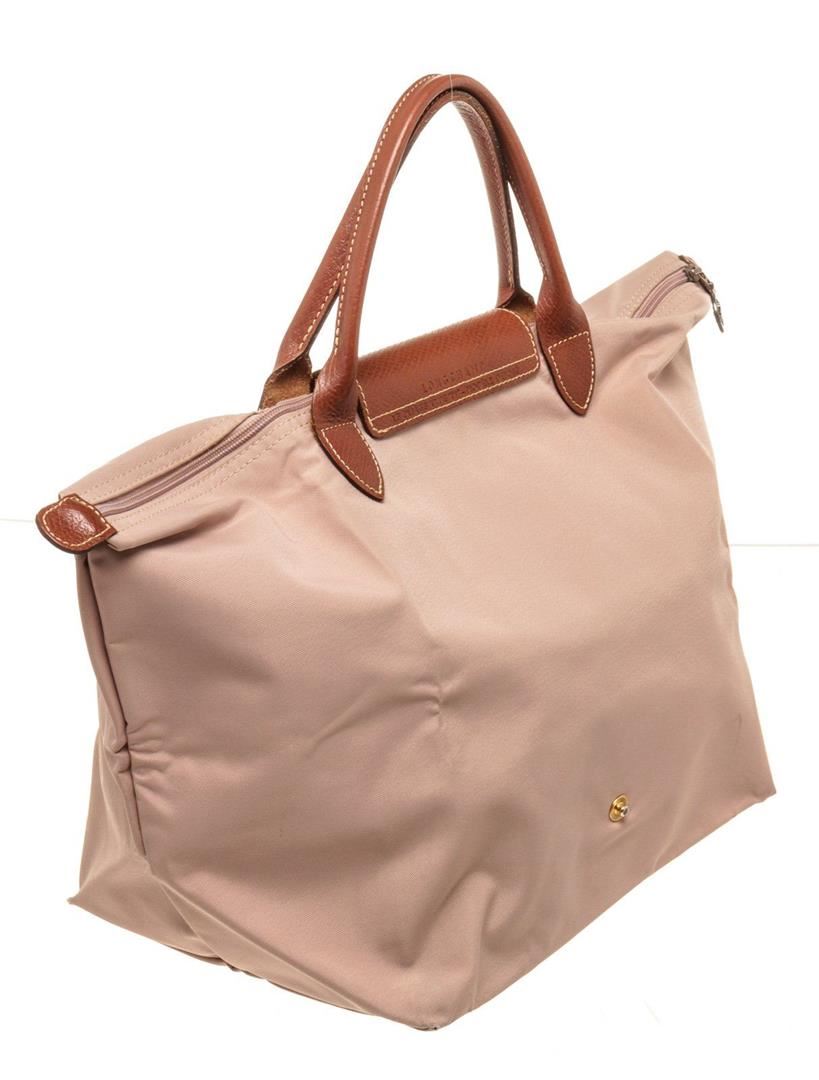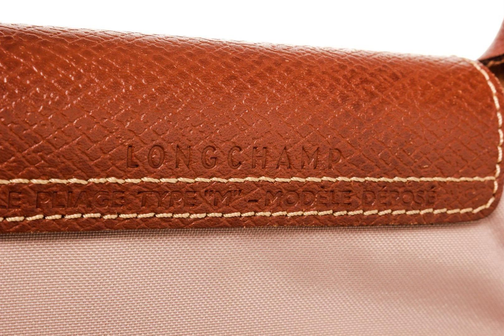 Longchamp Pink Canvas Convertible Shoulder Bag with silver-tone hardware, burgundy logo fabric interior lining, one slip pocket at interior wall and overall zipper top closure.