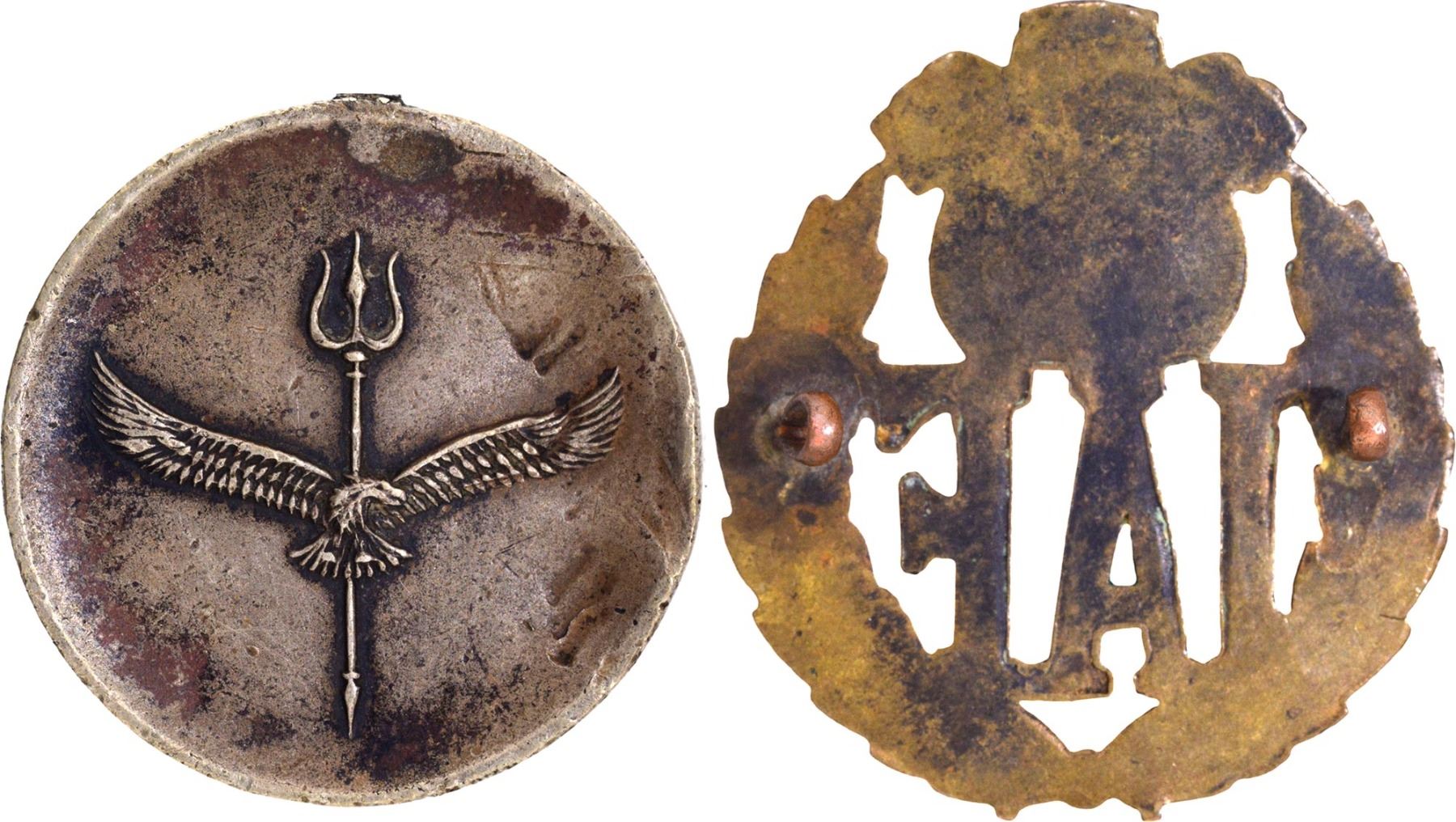 b. Indian Air Force badge, Bronze Cap Badge, die-struck cap badge with ‘IAF’ surmounted by the lion capital and surrounded by a wreath, two loops at the reverse to wear, 15.2g, 41.37mm,