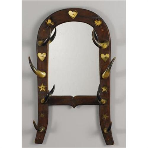 <B>UNKNOWN MAKER</B></I><BR><I>Longhorn Mirror</B></I>, early 1900s<BR>40 x 21 x 5-1/2 inches (101.6 x 53.3 x 14.0 cm)<BR>Unsigned<BR><BR> Yoke-shaped mirror with original mercury glass, horns, and applied horn, heart, leaf, and star motifs.<B>Condition Report:</B> Excellent condition with small loss from lower right hand star.<BR><BR><b>Shipping:</b> Requires 3rd Party Shipping (<a target="_blank" href="http://www.heritageauctions.com/common/shipping.php">view shipping information</a>)<BR><BR><B>Important notice: