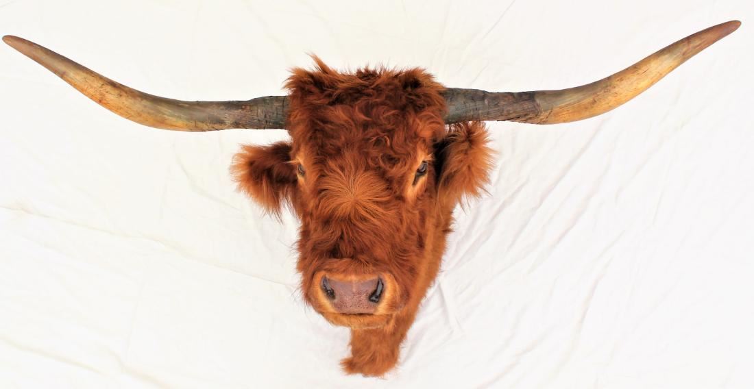 Impressive taxadermy mounted red haired steer with 64" horn span with great hair and expression.