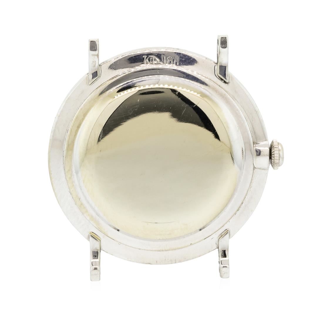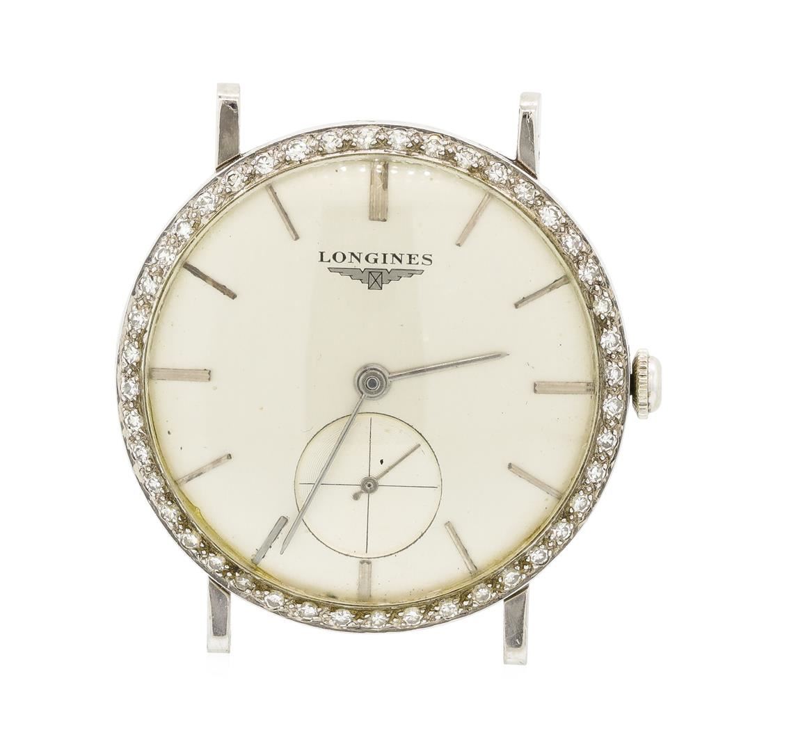 One 18KT white gold Longines watch without strap measuring 32.5 millimeters with a silver dial with stick markers and baton type hands with a second hand sub-dial and a diamond set bezel. The case number is 225002, the movement number is 8953323. The move