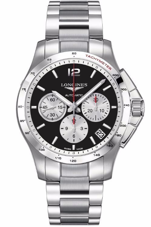 Model: L3.697.4.96.6 - CASE = [Material:Stainless Steel], [Case Diameter:44.5], [Case Thickness:14.7mm], [Bezel:Fixed], [Case Back:Solid], [Water Resistant:50 Meters - 150 Feet], [Crystal:Scratch Resistant Sapphire],; DIAL = [Color:Black],; MOVEMENT = [Type:Automatic Chronograph], [Crown:Screw Down],; BAND = [Clasp:Pushbutton Folding], [Type:Stainless Steel Brushed and Polished], (Usually ships in 1 to 2 weeks.)